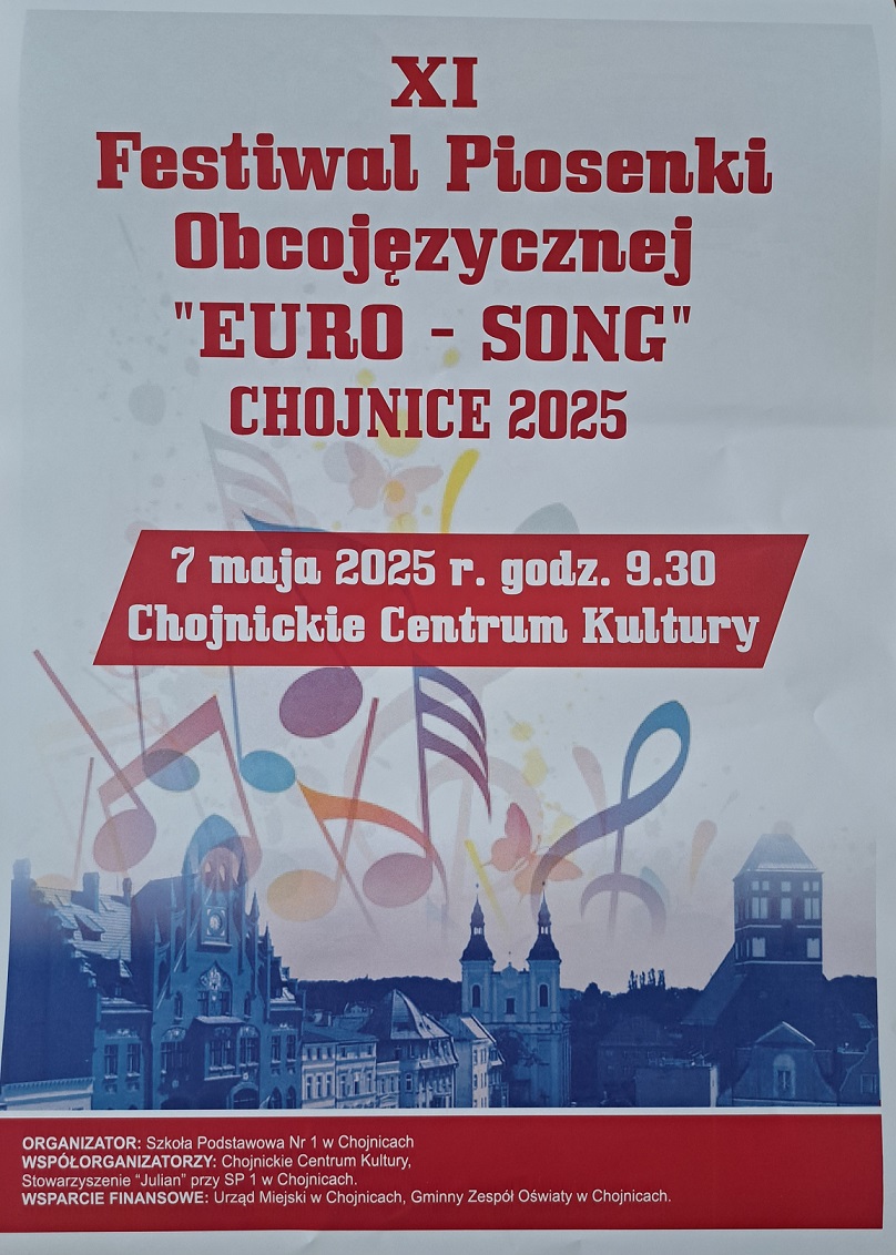 Dnia 7 maja (środa) z okazji Dnia Europy, od godz. 09:30 – w Chojnickim Centrum Kultury odbędzie się XI Festiwal piosenki obcojęzycznej „EURO-SONG” – Chojnice 2025, którego organizatorem jest Szkoła Podstawowa nr 1.