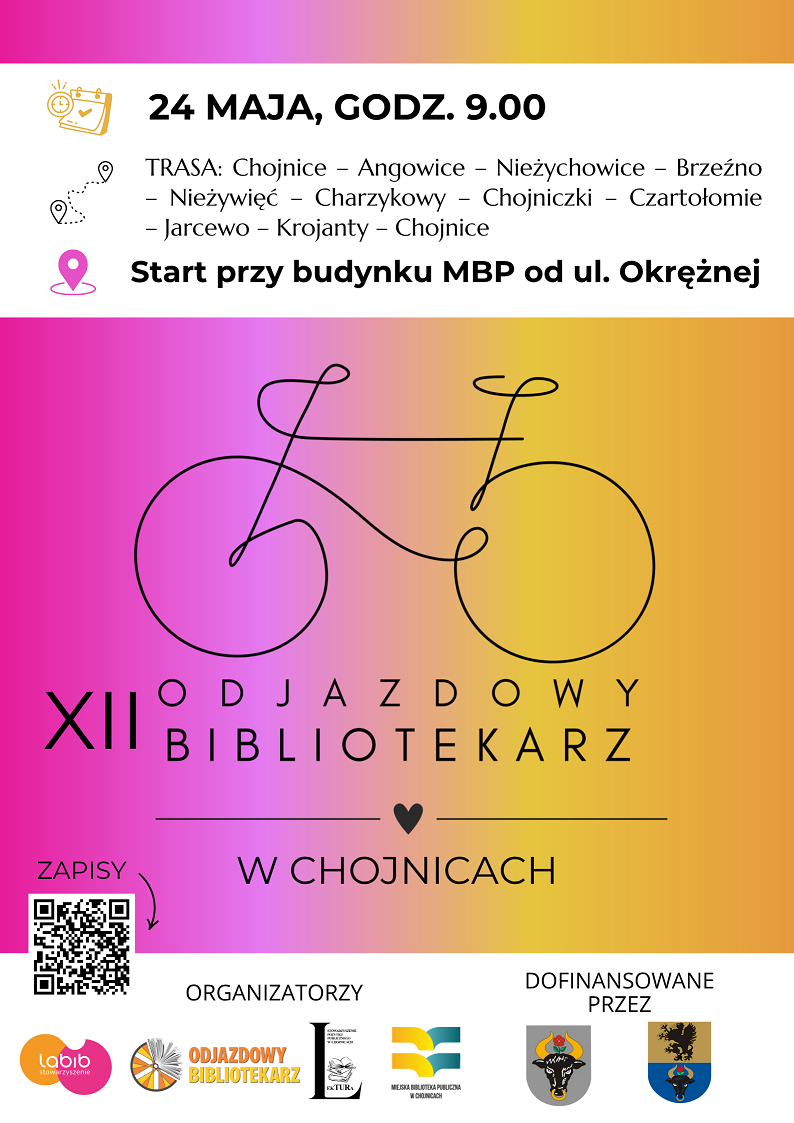 Stowarzyszenie LekTURa i Miejska Biblioteka Publiczna w Chojnicach już po raz dwunasty zapraszają do udziału w rajdzie rowerowym Odjazdowy Bibliotekarz w Chojnicach, który odbędzie się w sobotę 24 maja 2025 roku. Start o godz. 09:00. Zapisywać można się elektronicznie pod linkiem lub przez kod QR na plakacie.