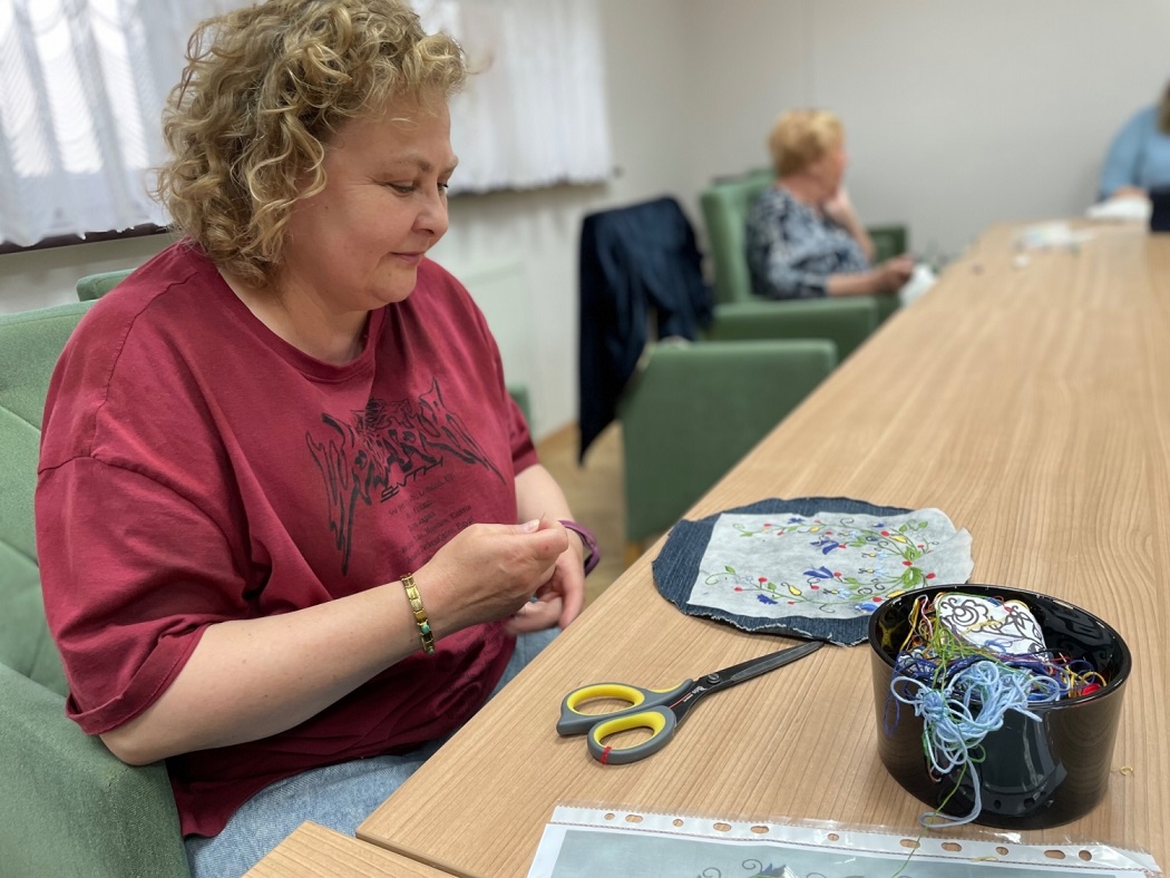 Druga połowa spotkania przebiegała już tradycyjnie – panie haftowały rozpoczęte prace, korzystając z porad prowadzącej zajęcia.