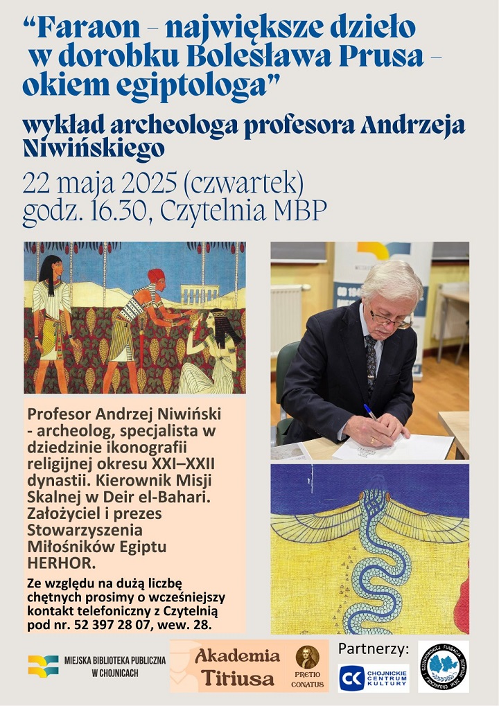 W czwartek 22 maja 2025 roku odbędzie się czwarty wykład archeologiczny profesora Andrzeja Niwińskiego. Prelekcja zatytułowana będzie „Faraon – największe dzieło w dorobku Bolesława Prusa – okiem egiptologa”. Początek o godz. 16:30 w Czytelni MBP. Chętnych prosimy o wcześniejsze zapisy pod numerem tel. 52 397 28 07, wew. 28.
