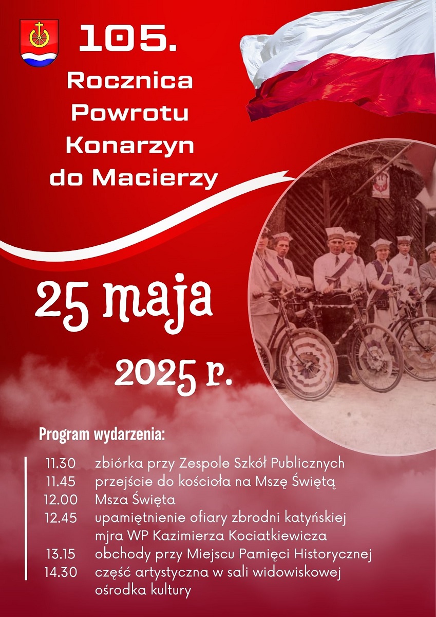 W dniu 25 maja 2025 roku mieszkańcy Konarzyn wspólnie uczczą 105. rocznicę powrotu miejscowości do Macierzy. Wydarzenie to ma ogromne znaczenie historyczne i patriotyczne, a jego obchody zapowiadają się wyjątkowo uroczyście.