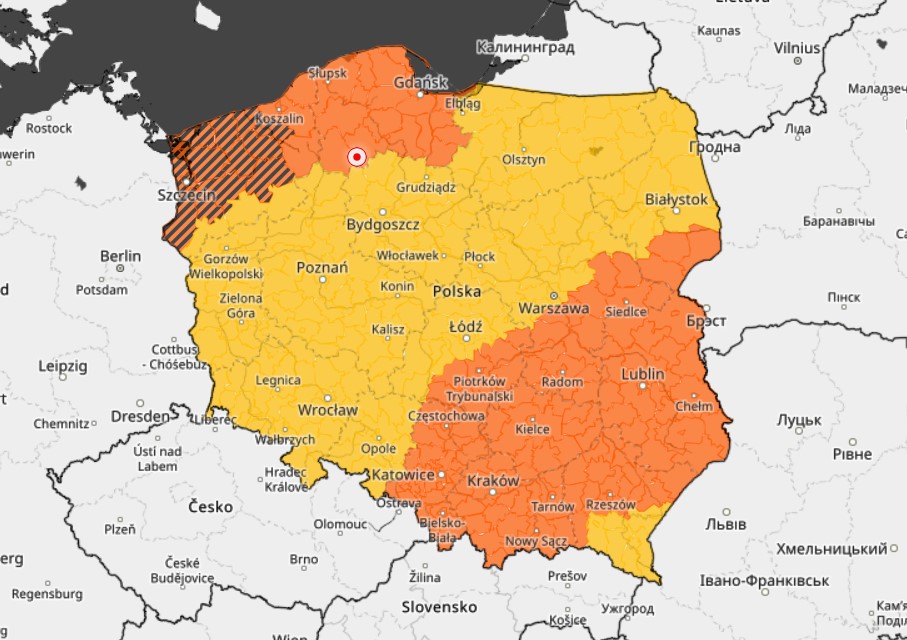 Prognozowane są burze, którym miejscami będą towarzyszyć silne opady deszczu do 30 mm, oraz porywy wiatru do 90 km/h. Lokalnie duży grad.