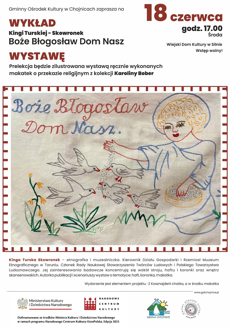 Gminny Ośrodek Kultury w Chojnicach zaprasza na kolejne spotkanie z cyklu poświęconego makatkom – wyjątkowym tkaninom, które kiedyś często zdobiły wnętrza domów - nie tylko wiejskich. Tym razem tematem prelekcji będą makatki o przekazie religijnym, a wykład zatytułowany Boże Błogosław Dom Nasz wygłosi Kinga Turska-Skowronek – etnografka i muzealniczka, której zainteresowania badawcze koncentrują się wokół haftu, koronki oraz wnętrz w skansenach.