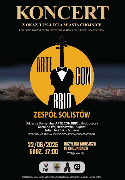 Już w tę niedzielę 22 czerwca 2025r. o godz. 17:00, zapraszamy na koncert w ramach 750 - lecia naszego miasta. Wystąpi orkiestra kameralna "Arte Con Brio" z Bydgoszczy wraz z solistami: Karolina Wojciechowska - sopran, Julian Iwański - baryton. W programie najpiękniejsze arie z kantat i oratoriów.