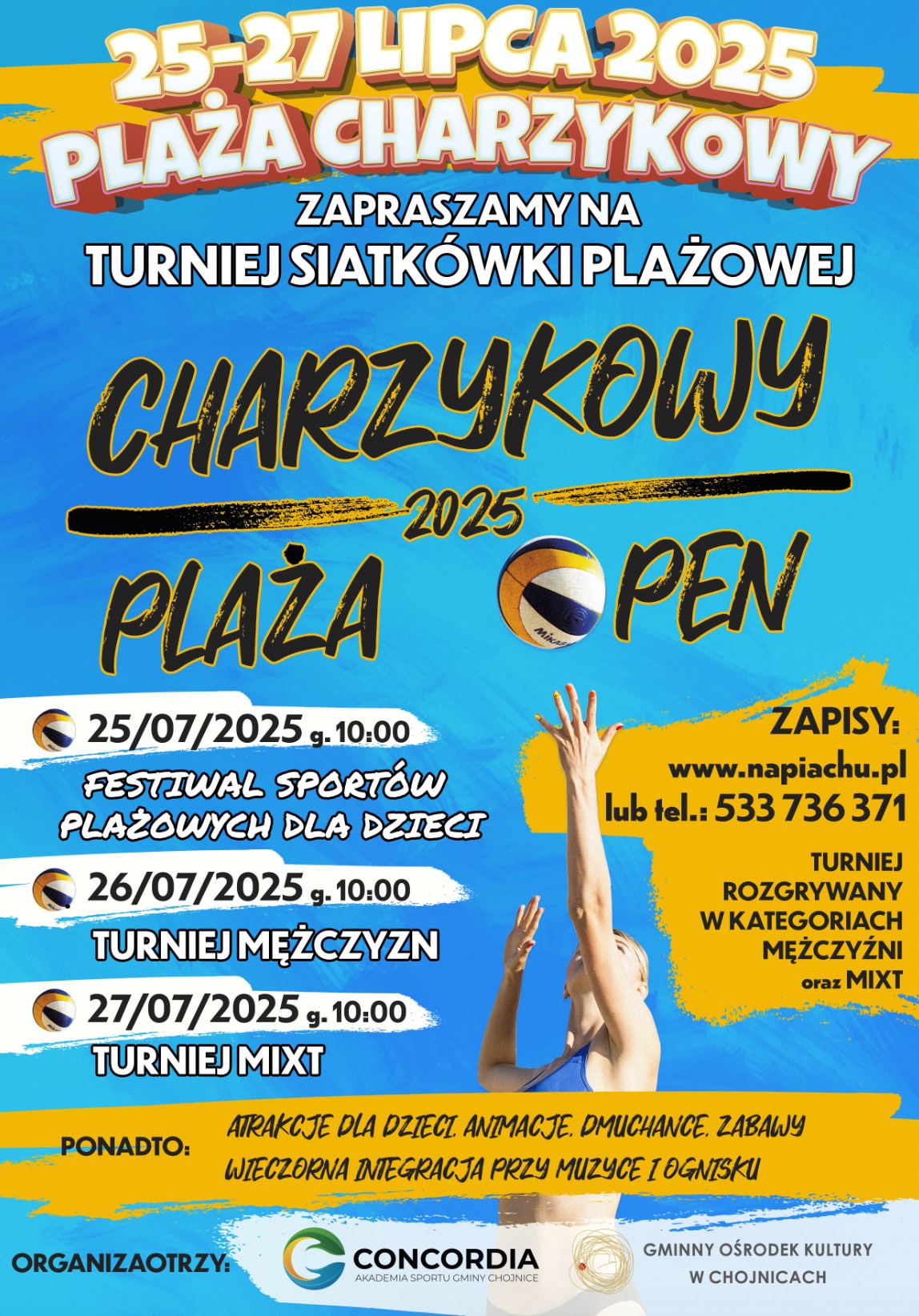 Główna część wydarzenia przypadnie na weekend – 26 i 27 lipca – kiedy rozegrany zostanie turniej siatkówki plażowej w dwóch kategoriach: mężczyźni oraz mixt (zespół kobieta + mężczyzna).