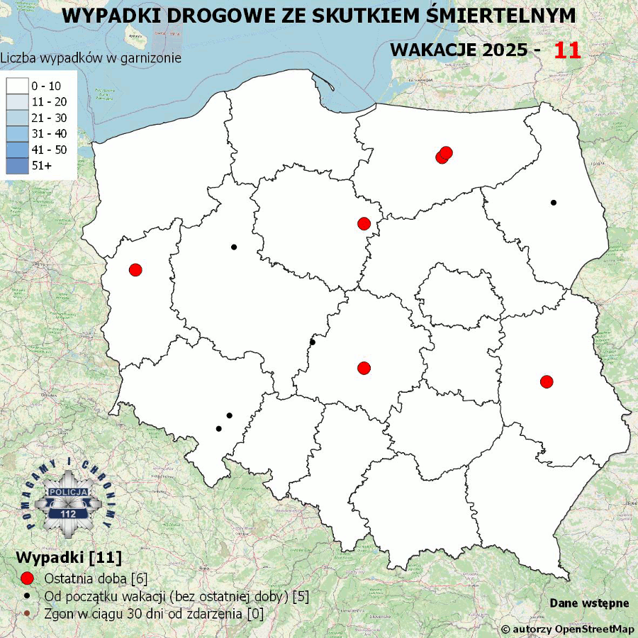 Policyjna mapa wypadków drogowych ze skutkiem śmiertelnym - Wakacje 2025