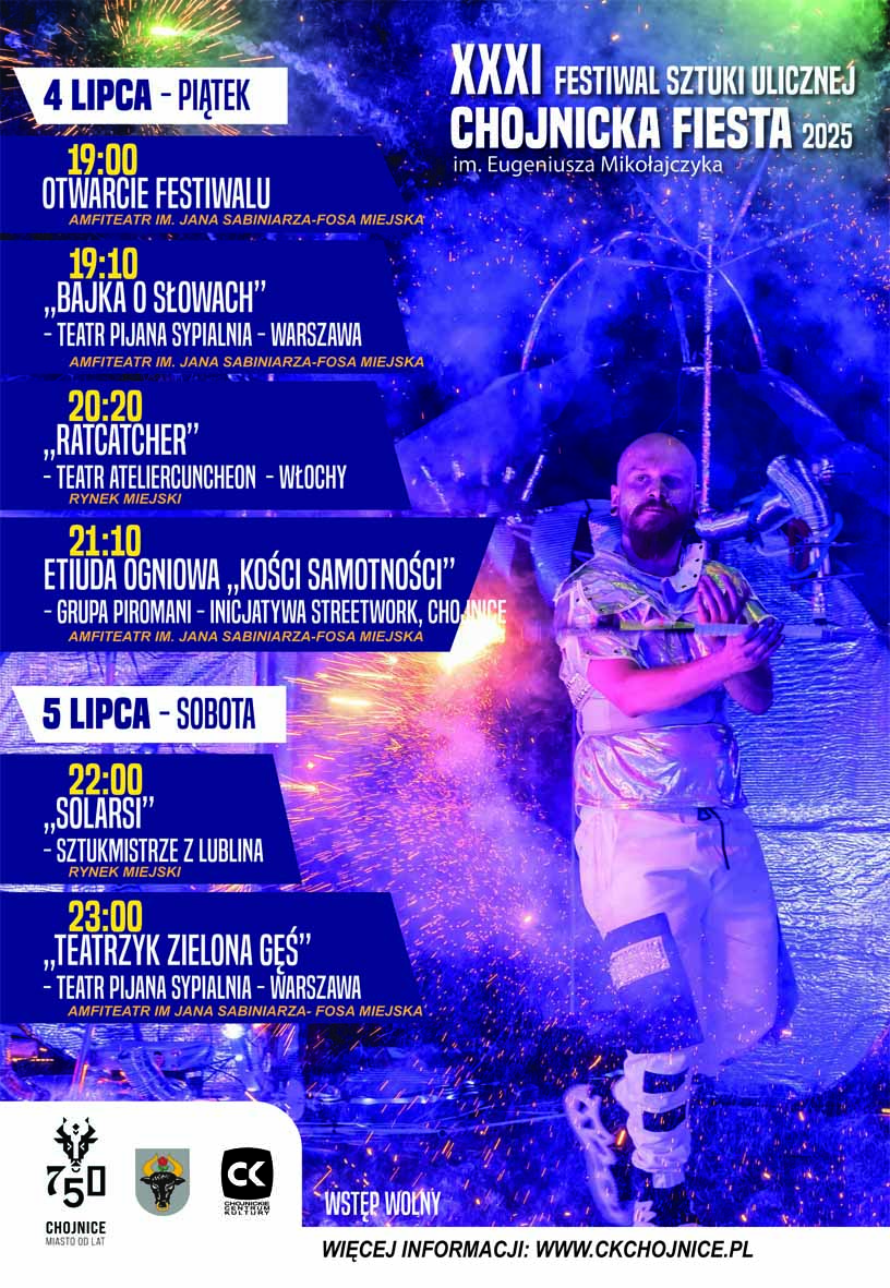 Chojnickie Centrum Kultury serdecznie zaprasza na XXXI Fiestę Teatralną im. Eugeniusza Mikołajczyka, która odbędzie się 4 i 5 lipca 2025 roku. Tegoroczna edycja, choć wierna duchowi festiwalu, przynosi delikatną zmianę – wszystkie spektakle będą prezentowane wieczorem, w porze, która sprzyja teatralnym emocjom i nastrojowi pełnemu magii.
