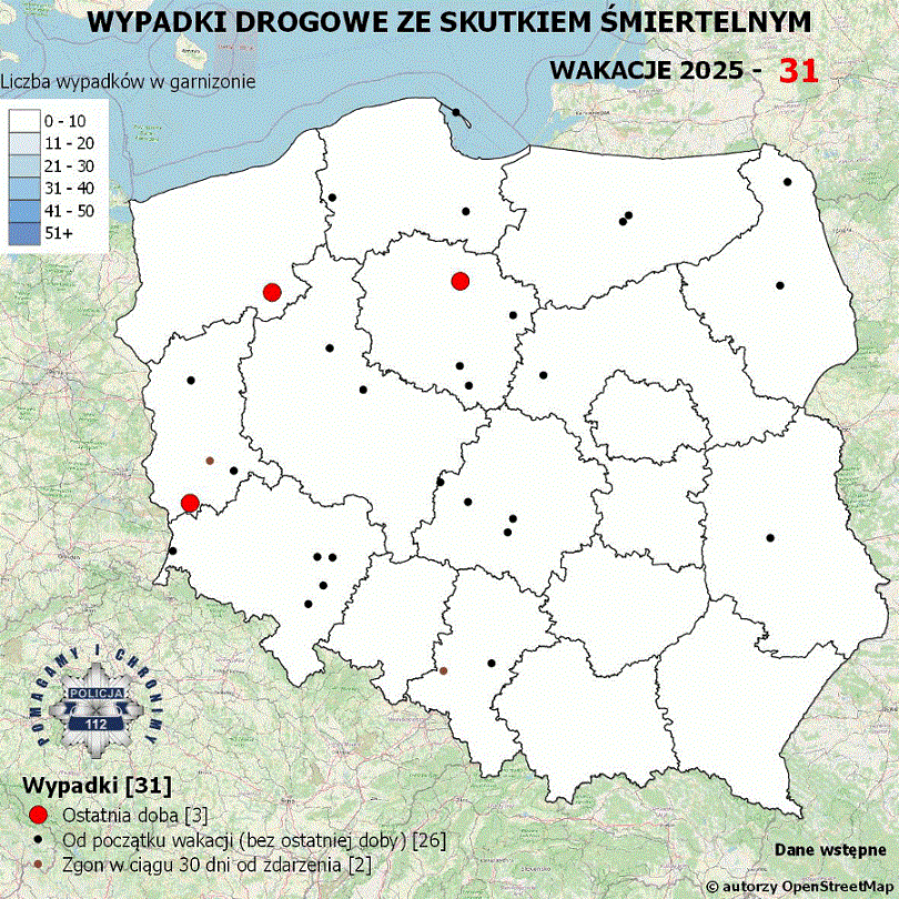 Policyjna mapa wypadków drogowych ze skutkiem śmiertelnym - Wakacje 2025
