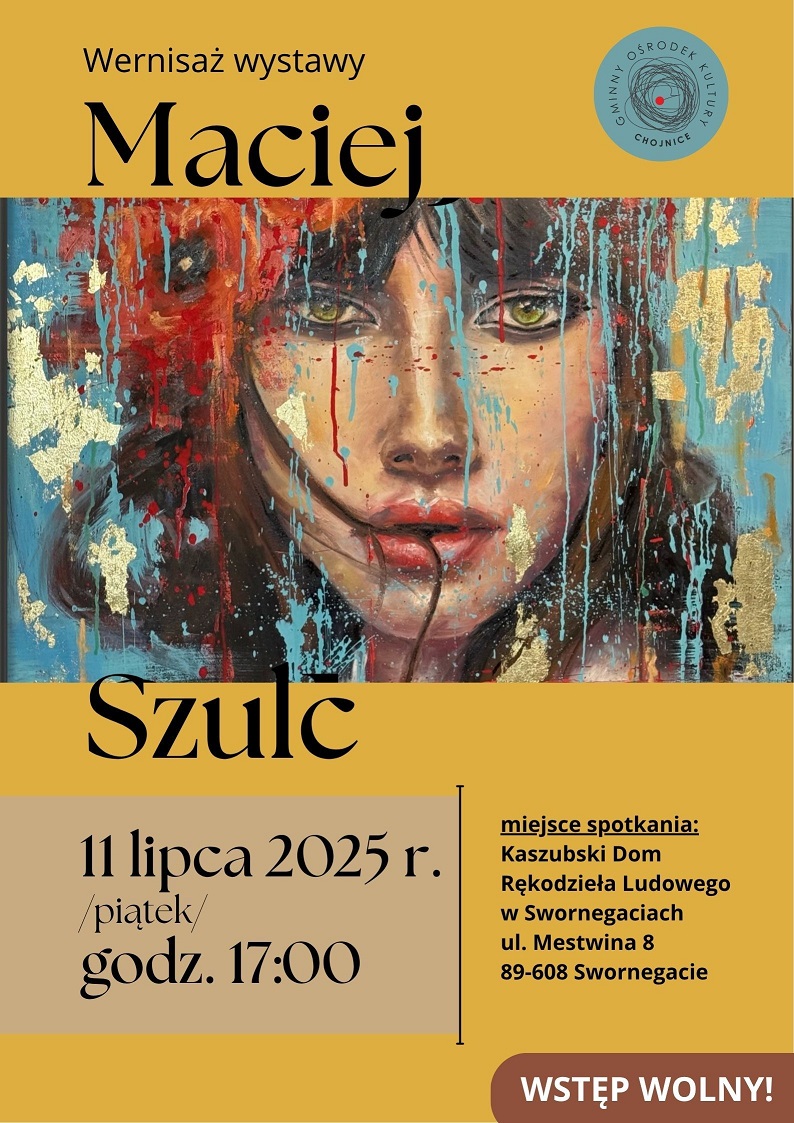 Maciej Szulc to artysta znany z niebanalnych i niezwykle ekspresyjnych obrazów, które przyciągają uwagę intensywnymi barwami i emocjonalnym przekazem. Na plakacie promującym wydarzenie widnieje obraz przedstawiający kobietę o hipnotyzującym spojrzeniu, w otoczeniu feerii kolorów i złotych akcentów, co zapowiada niecodzienną ucztę dla oczu.