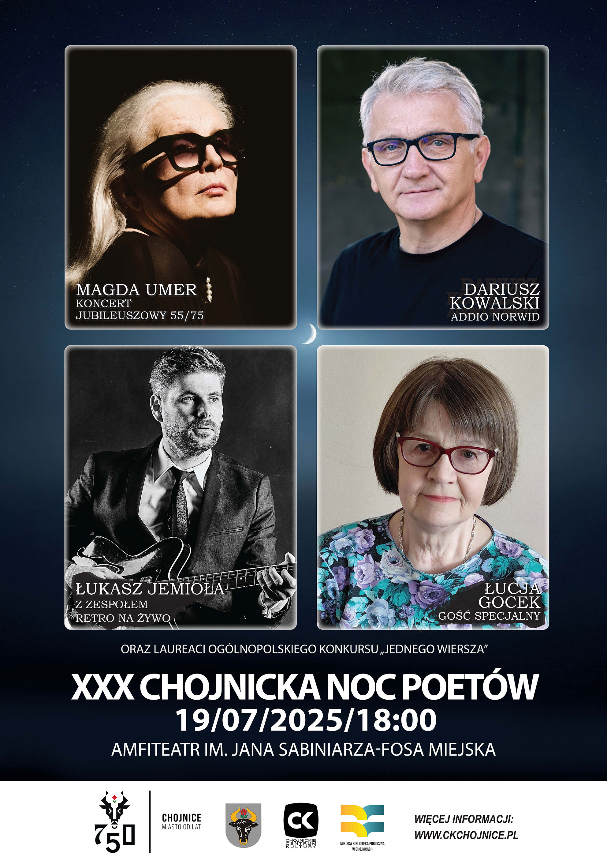 Chojnicka Noc Poetów to nie tylko program – to wieczór, który warto przeżyć. Dla słów, które trafiają do środka. Dla muzyki, która zostaje w głowie. Dla obecności, której coraz częściej nam brakuje. Zapraszamy serdecznie – spotkajmy się tam, gdzie poezja mówi do nas ludzkim głosem.
