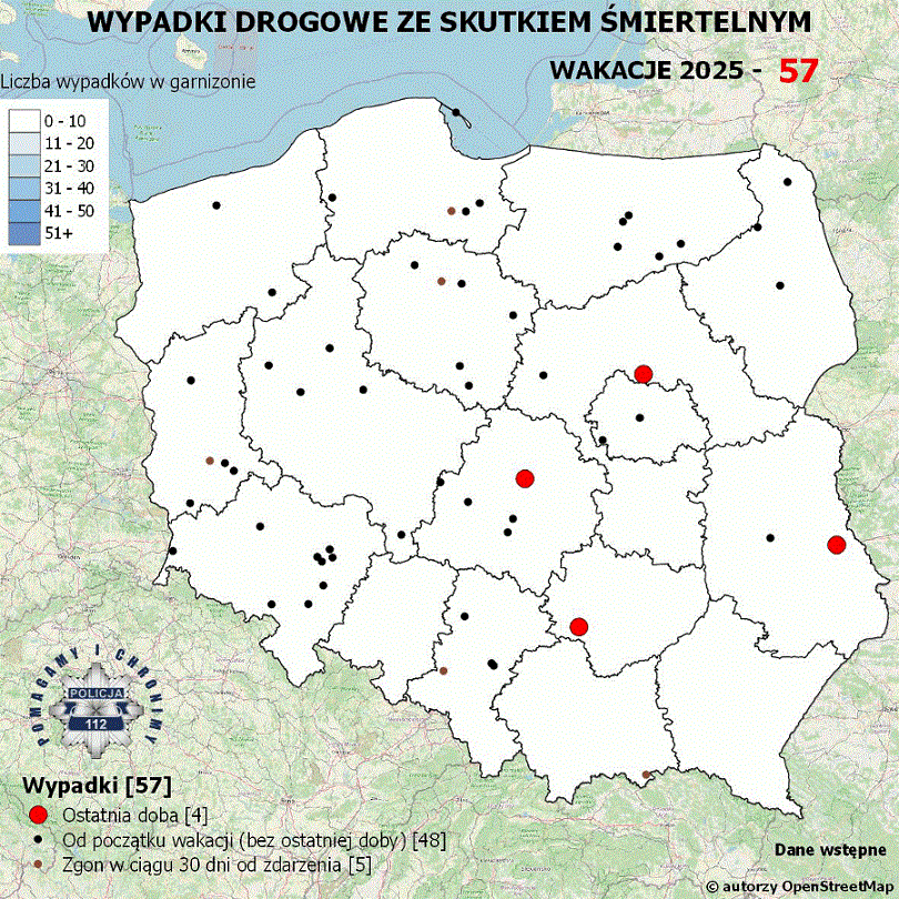 Policyjna mapa wypadków drogowych ze skutkiem śmiertelnym - Wakacje 2025