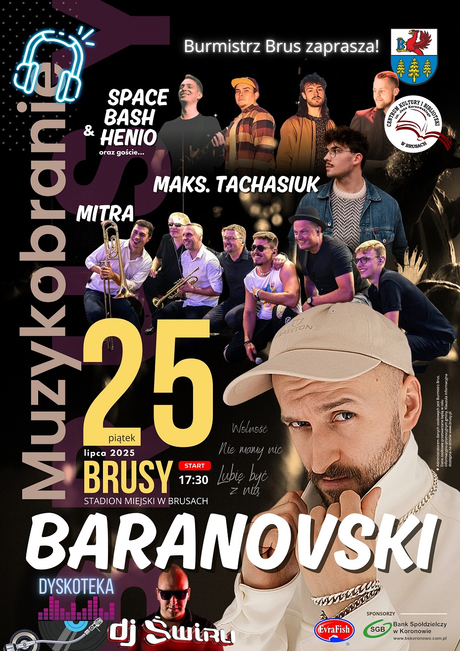 Gwiazdą wieczoru będzie niezwykle popularny i charyzmatyczny Baranovski – artysta, którego przeboje, takie jak „Lubię być z nią” czy „Nie mamy nic”, na stałe wpisały się w krajobraz polskiej sceny muzycznej. Jego koncert to gwarancja emocji, świetnego brzmienia i kontaktu z publicznością na najwyższym poziomie.