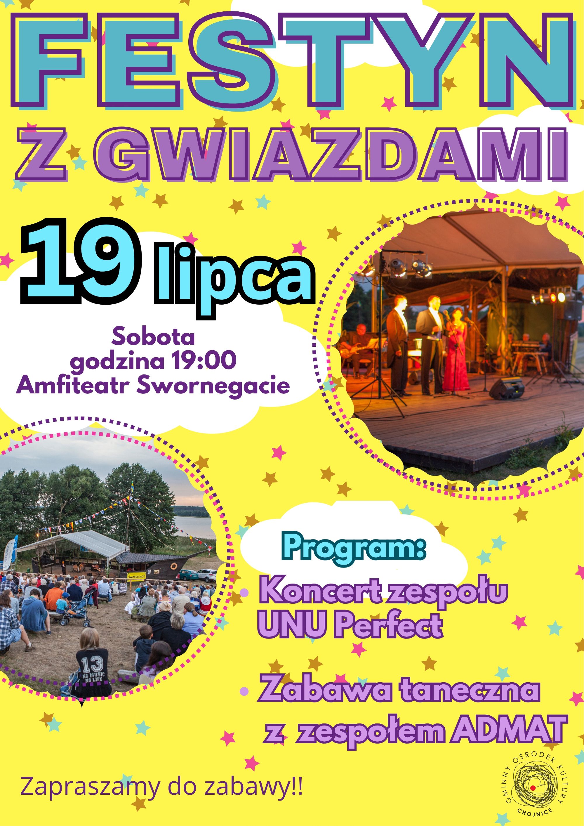W sobotę, 19 lipca, w amfiteatrze w Swornegaciach odbędzie się wydarzenie pod nazwą Festyn z Gwiazdami. Początek zaplanowano na godzinę 19:00. W programie przewidziano koncert zespołu UNU Perfect, a następnie zabawę taneczną z zespołem ADMAT.
