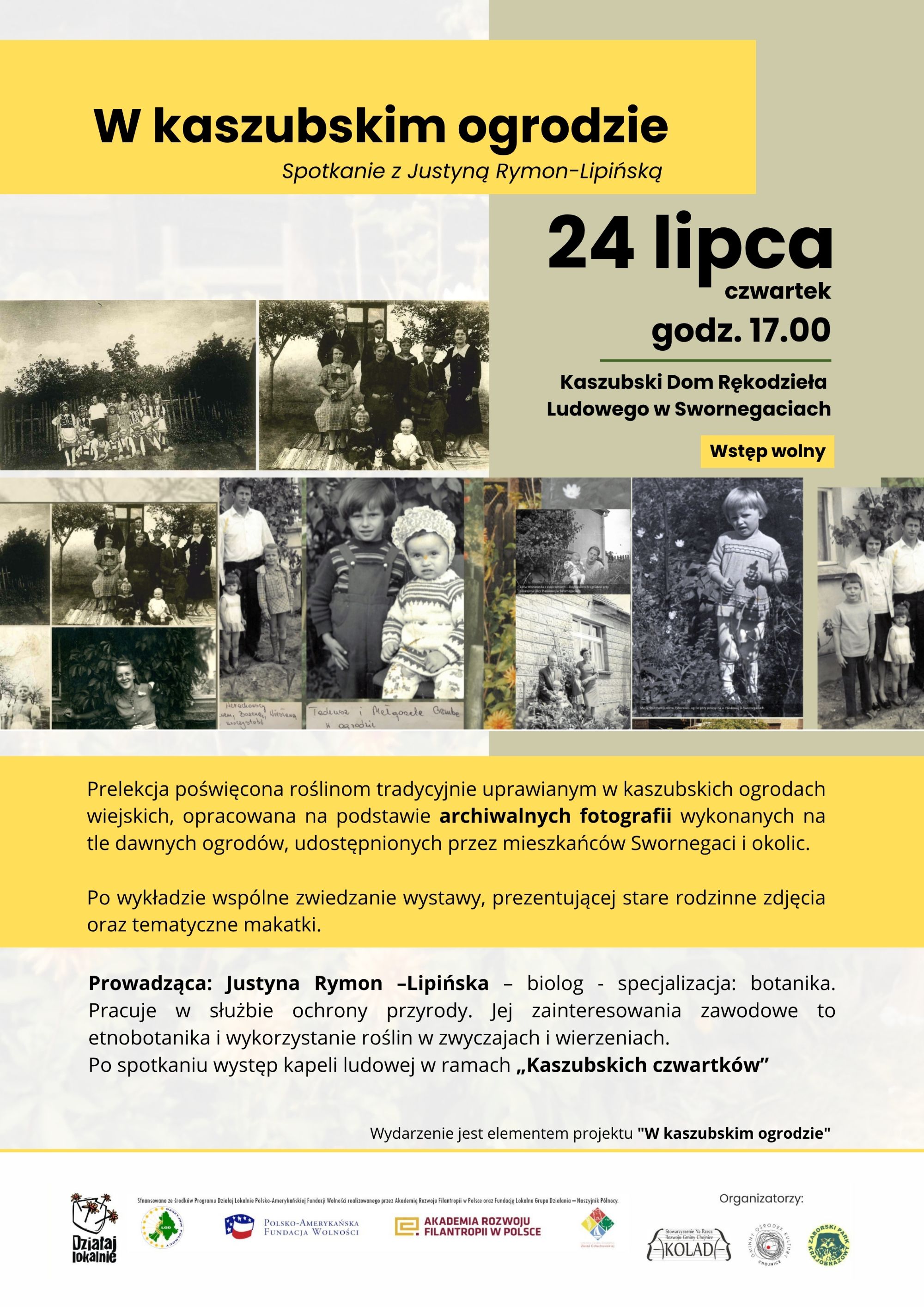 24 lipca o godz. 17:00 (czwartek) w Kaszubskim Domu Rękodzieła Ludowego w Swornegaciach odbędzie się spotkanie poświęcone roślinom tradycyjnie uprawianym w wiejskich ogrodach Kaszub. Prelekcję poprowadzi Justyna Rymon-Lipińska – biolog specjalizująca się w botanice i etnobotanice, na co dzień pracująca w służbie ochrony przyrody.