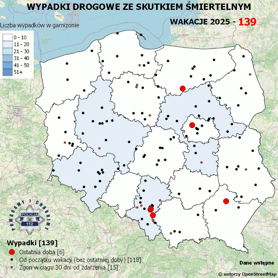 Policyjna mapa wypadków drogowych ze skutkiem śmiertelnym - Wakacje 2025