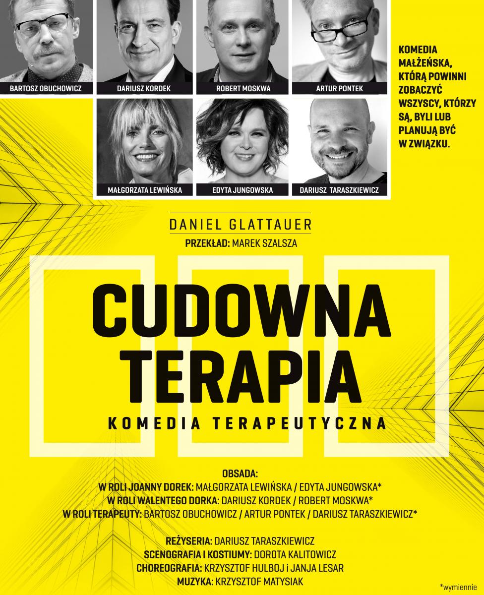 Czy za pomocą różnych ćwiczeń terapeutycznych uda się pojednać parę, która potrafi urządzać sobie niezłe piekło? Czy specjalista znajdzie sposób, by małżonkowie zrozumieli, jak wiele ich łączy, by zaczęli ze sobą współpracować i słyszeć się wzajemnie? I czy przypadkiem terapeuta po spotkaniu z taką parą sam nie będzie potrzebował pomocy? Odpowiedzi na te pytania znajdą Państwo w najnowszej inscenizacji komedii austriackiego dramatopisarza Daniela Glattauera „Cudowna terapia”. Czekają Was błyskotliwe dialogi, zabawne życiowe sytuacje i trzy wspaniałe kreacje aktorskie.
