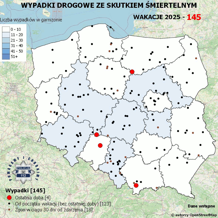 Policyjna mapa wypadków drogowych ze skutkiem śmiertelnym - Wakacje 2025