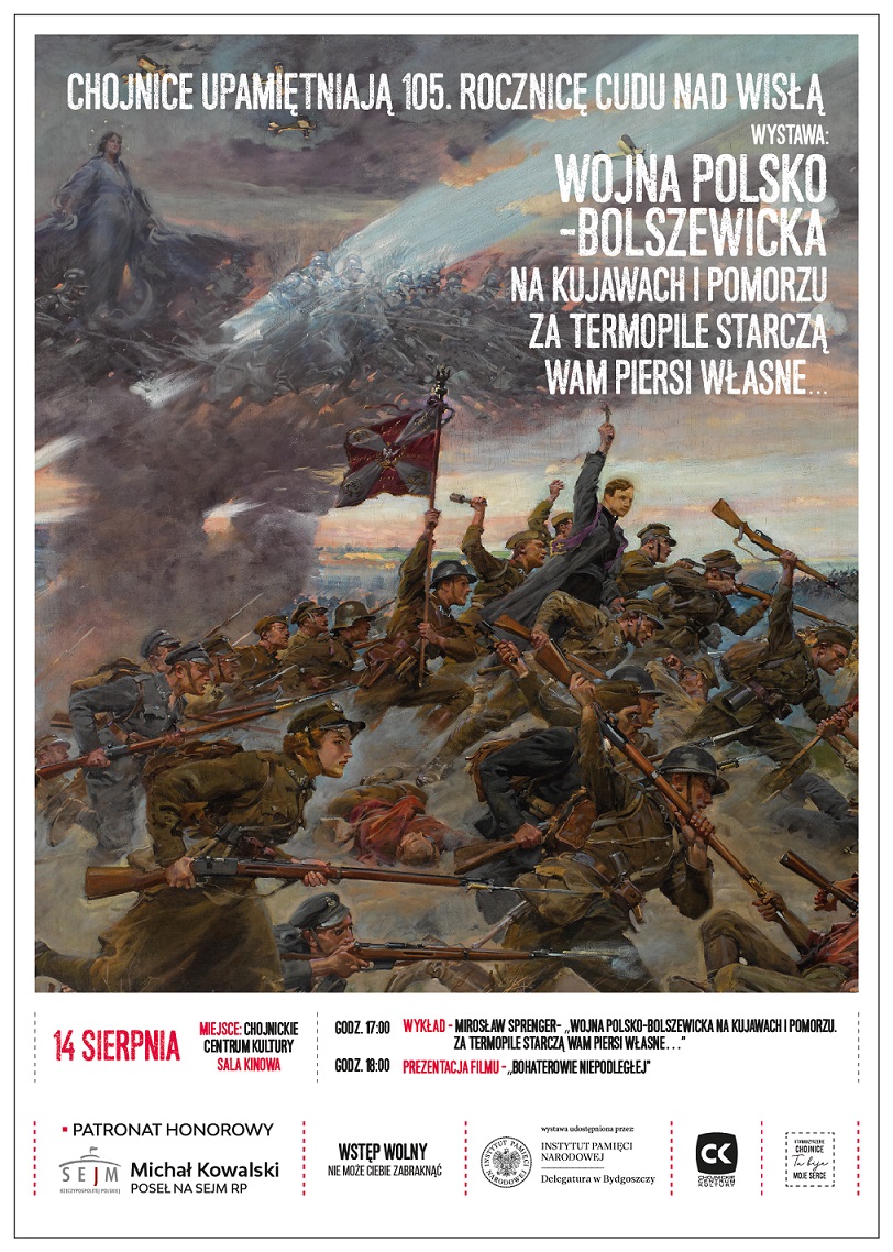Serdecznie zapraszamy wszystkich na chojnickie obchody 105. rocznicy Cudu nad Wisłą, współorganizowane przez Stowarzyszenie „Chojnice – Tu bije moje serce” oraz Chojnickie Centrum Kultury. Wszystkie materiały zostały udostępnione przez bydgoską Delegaturę Instytutu Pamięci Narodowej.