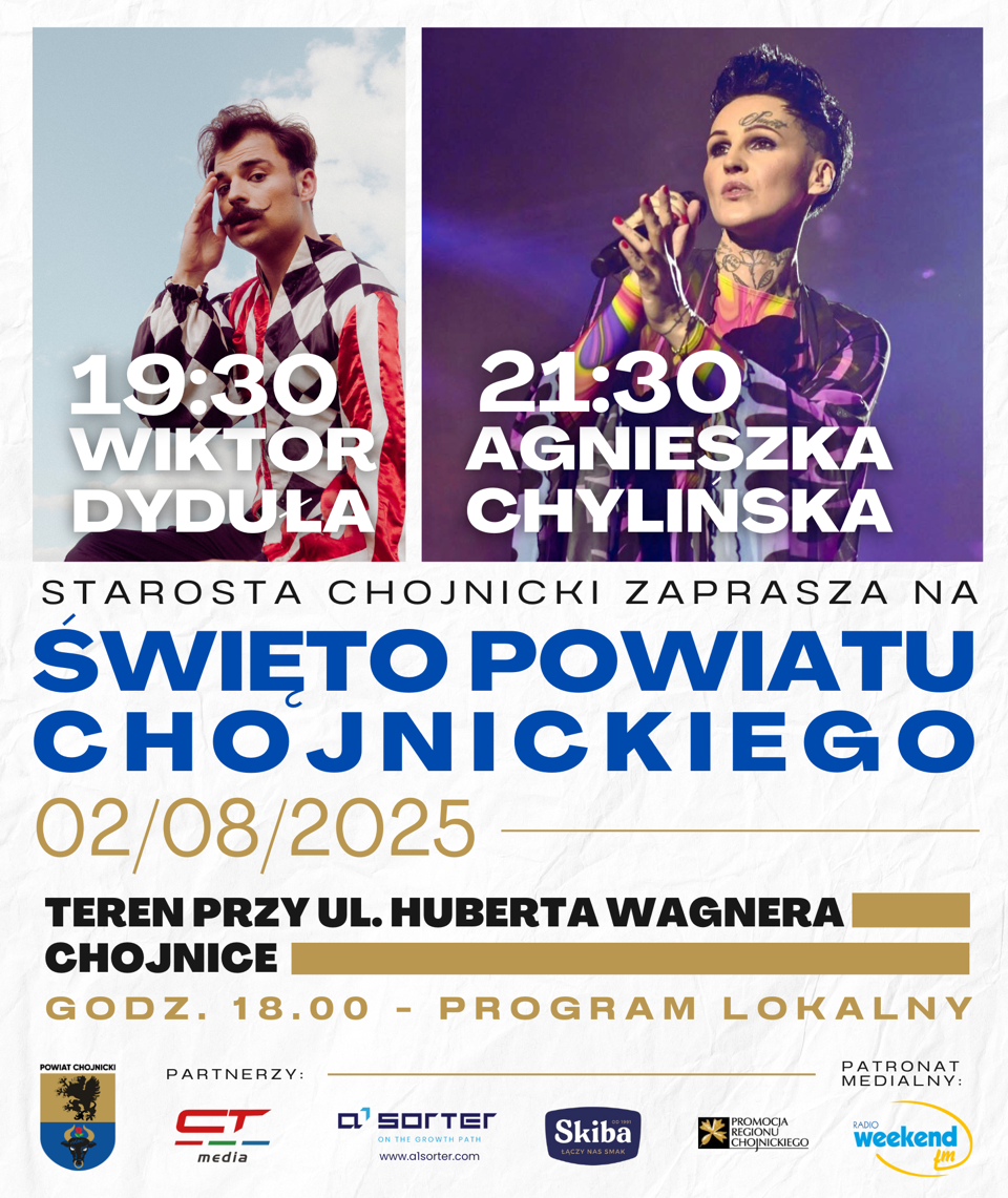 W sobotę 2 sierpnia teren przy ul. Huberta Wagnera w Chojnicach ponownie zamieni się w centrum muzycznej rozrywki. Starostwo Powiatowe zaprasza mieszkańców i gości na Święto Powiatu Chojnickiego, którego kulminacyjnym punktem będą wieczorne koncerty dwóch znanych wykonawców. Na scenie pojawią się Wiktor Dyduła i Agnieszka Chylińska.