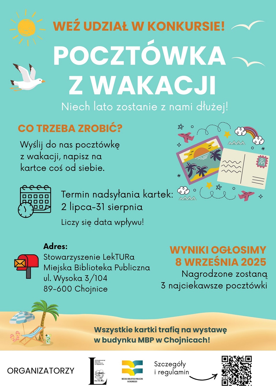 Stowarzyszenie LekTURa oraz Miejska Biblioteka Publiczna w Chojnicach zapraszają do udziału w konkursie „Pocztówka z wakacji”! Zadanie polega na wysłaniu do nas wakacyjnej pocztówki. Może to być kartka z podróży, z rodzinnych stron albo z wymarzonego miejsca. Liczy się pomysł, treść oraz forma – każda kartka to małe dzieło sztuki!