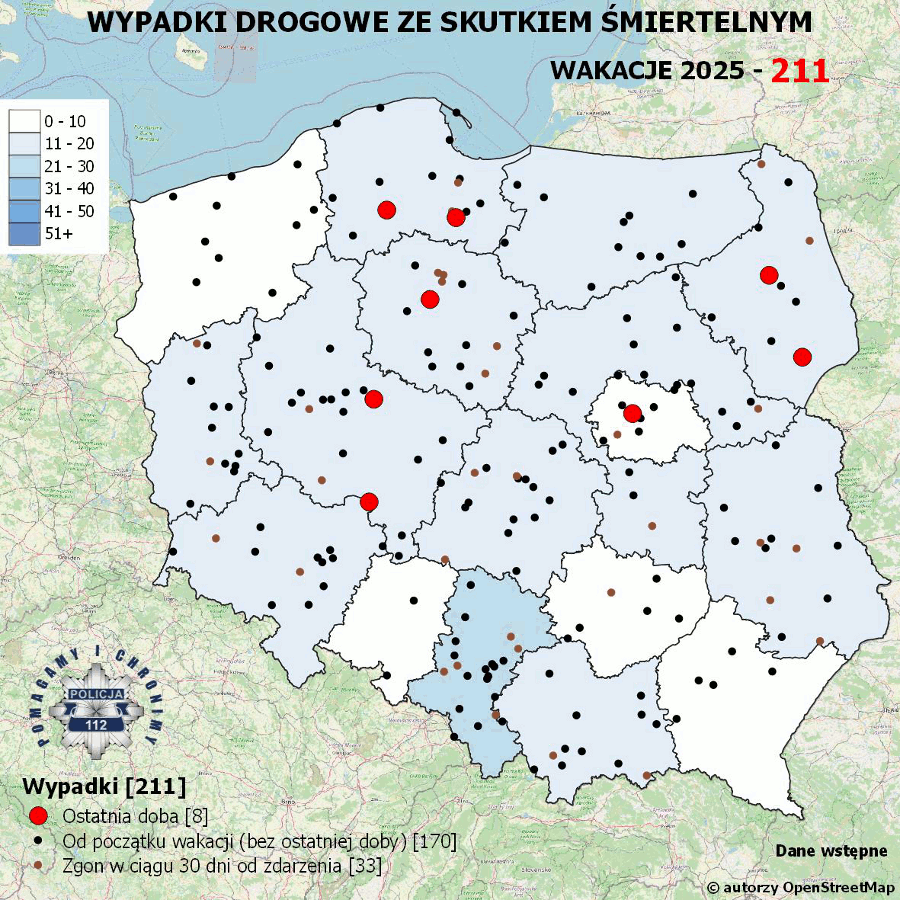 Policyjna mapa wypadków drogowych ze skutkiem śmiertelnym - Wakacje 2025