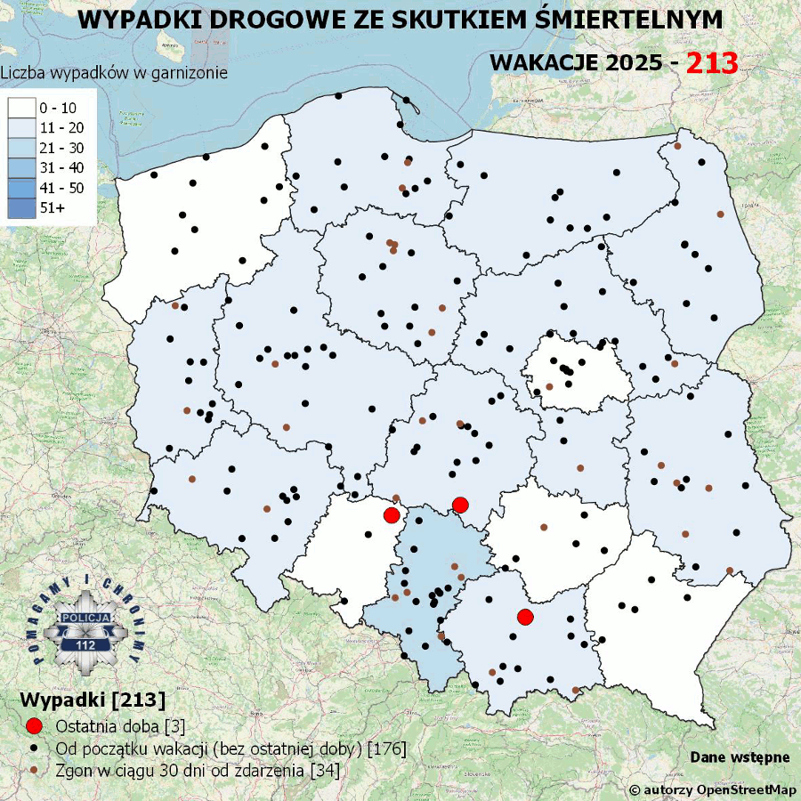 Policyjna mapa wypadków drogowych ze skutkiem śmiertelnym - Wakacje 2025