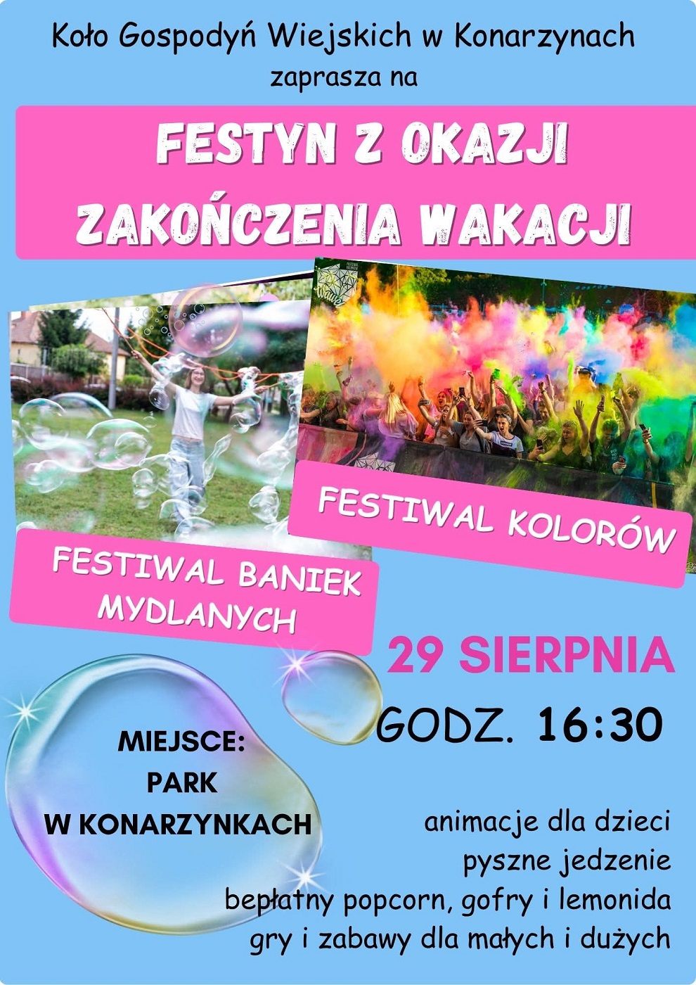 Koło Gospodyń Wiejskich w Konarzynach zaprasza wszystkich mieszkańców oraz gości na wyjątkowe wydarzenie – Festyn z okazji zakończenia wakacji, który odbędzie się 29 sierpnia o godzinie 16:30 w parku w Konarzynkach.