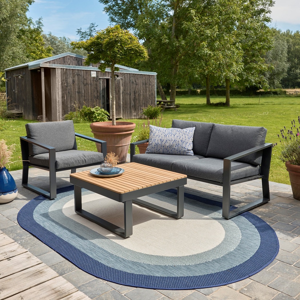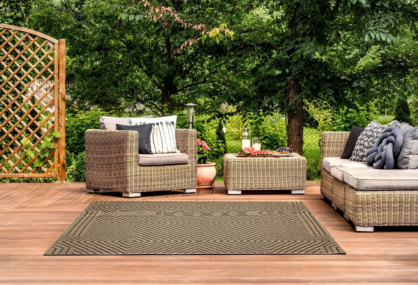 Estetycznie dywan scala aranżację i porządkuje przestrzeń. Wokół stołu tworzy wydzieloną strefę jadalnianą, a przy sofie i fotelach podkreśla część wypoczynkową. Dzięki temu nawet niewielki taras może wyglądać spójnie i elegancko.