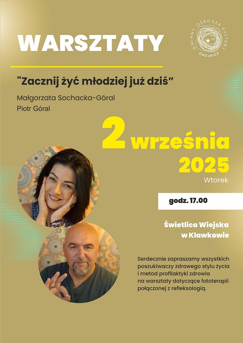 Już 2 września 2025 roku (wtorek) w Świetlicy Wiejskiej w Klawkowie odbędą się wyjątkowe warsztaty pod hasłem „Zacznij żyć młodziej już dziś”. Spotkanie poprowadzą Małgorzata Sochacka-Góral oraz Piotr Góral - pasjonaci zdrowego stylu życia i naturalnych metod wspierania organizmu.