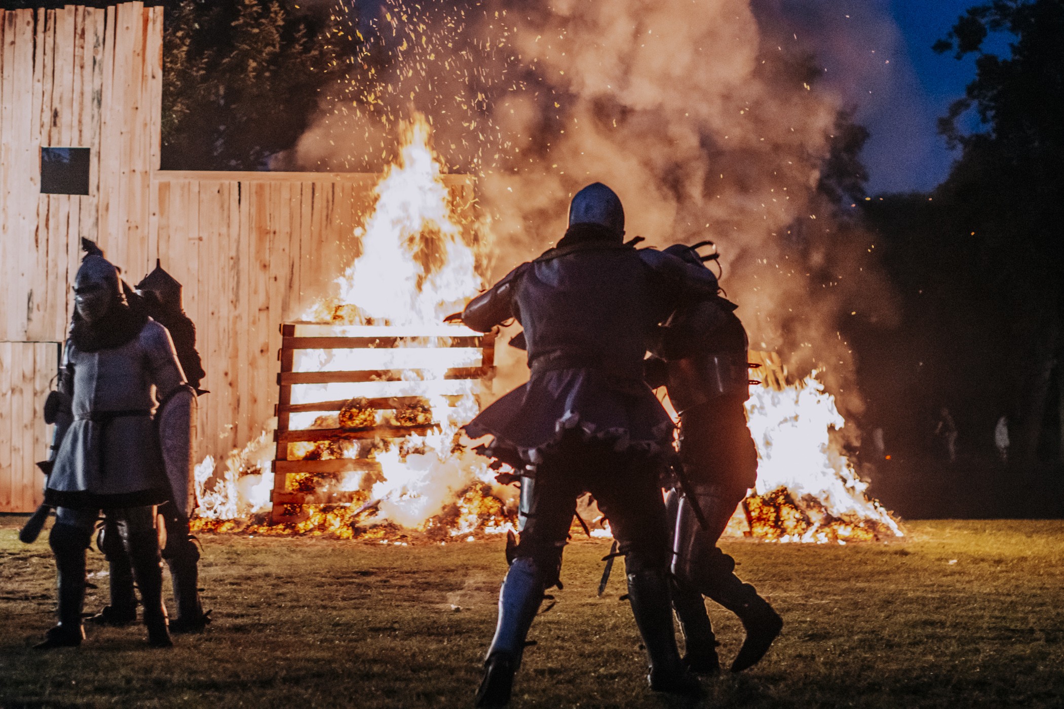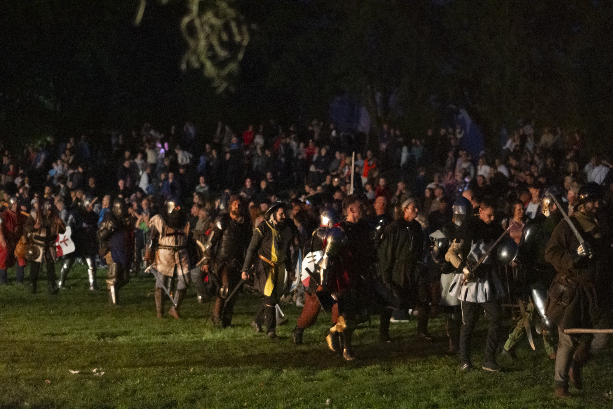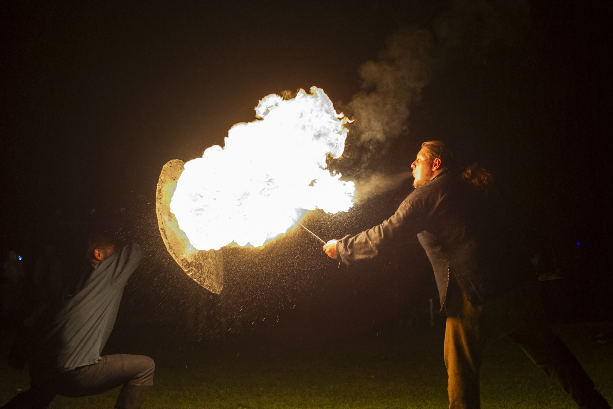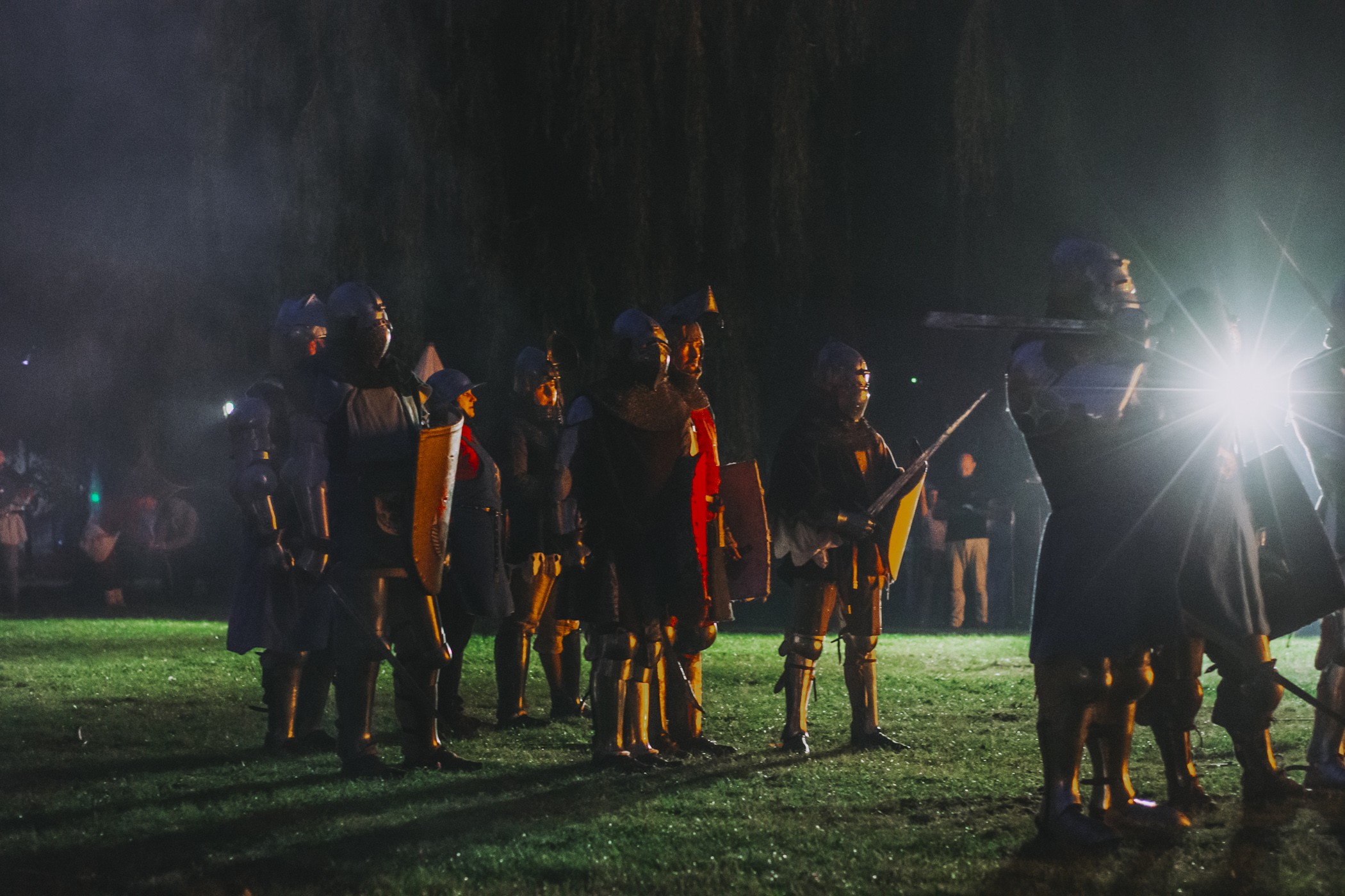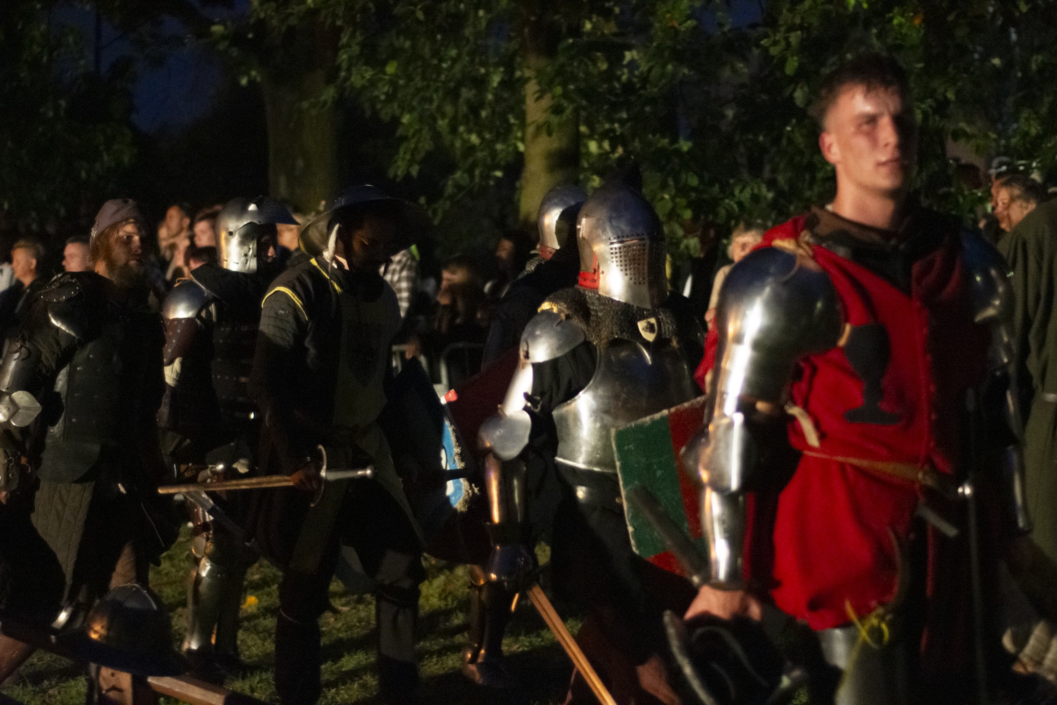 O 20:00 publiczność wstrzymała oddech, gdy rozpoczęła się wielka inscenizacja bitwy pod Chojnicami. Huk, wrzawa i walka na całego – tym razem bez ofiar, za to z ogromnym ładunkiem adrenaliny i emocji. A gdy zapadła noc, nad parkiem rozbłysło fireshow grupy Tempora Militum. Ogień tańczył w rytmie bębnów, a zgromadzeni wiedzieli, że oto zakończyła się prawdziwa uczta dla wojowników i gawiedzi.
