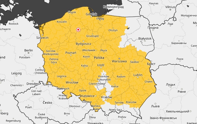 Prognozowane są burze, którym miejscami będą towarzyszyć silne opady deszczu od 20 mm do 30 mm oraz porywy wiatru do 75 km/h. Lokalnie grad.
