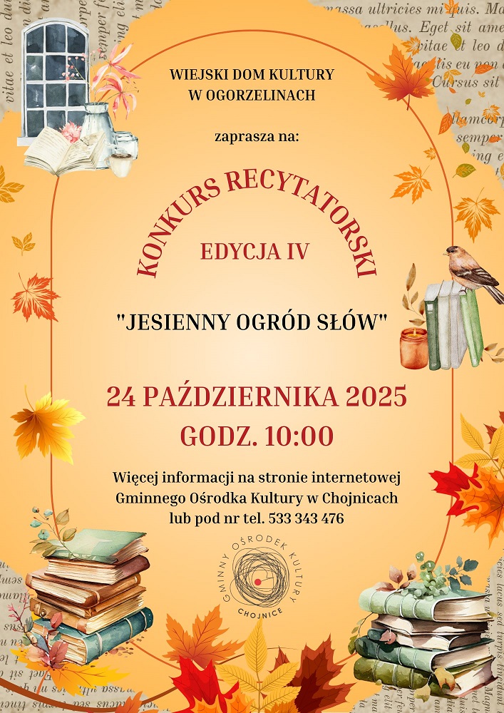 Jesień to czas, w którym słowo nabiera szczególnego znaczenia - pełne barw, nostalgii i refleksji. Już 24 października 2025 roku o godzinie 10:00 w Wiejskim Domu Kultury w Ogorzelinach odbędzie się IV edycja Konkursu Recytatorskiego „Jesienny Ogród Słów”.