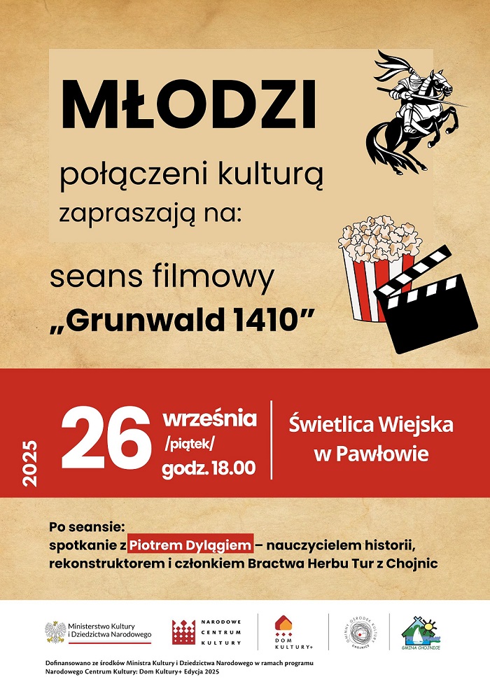 Tego dnia mieszkańcy będą mieli okazję obejrzeć film historyczny „Grunwald 1410”, przenoszący widzów w czasy jednej z najważniejszych bitew w dziejach Polski i Europy. To nie tylko spotkanie z historią, lecz także okazja do wspólnego przeżywania kultury i integracji lokalnej społeczności.