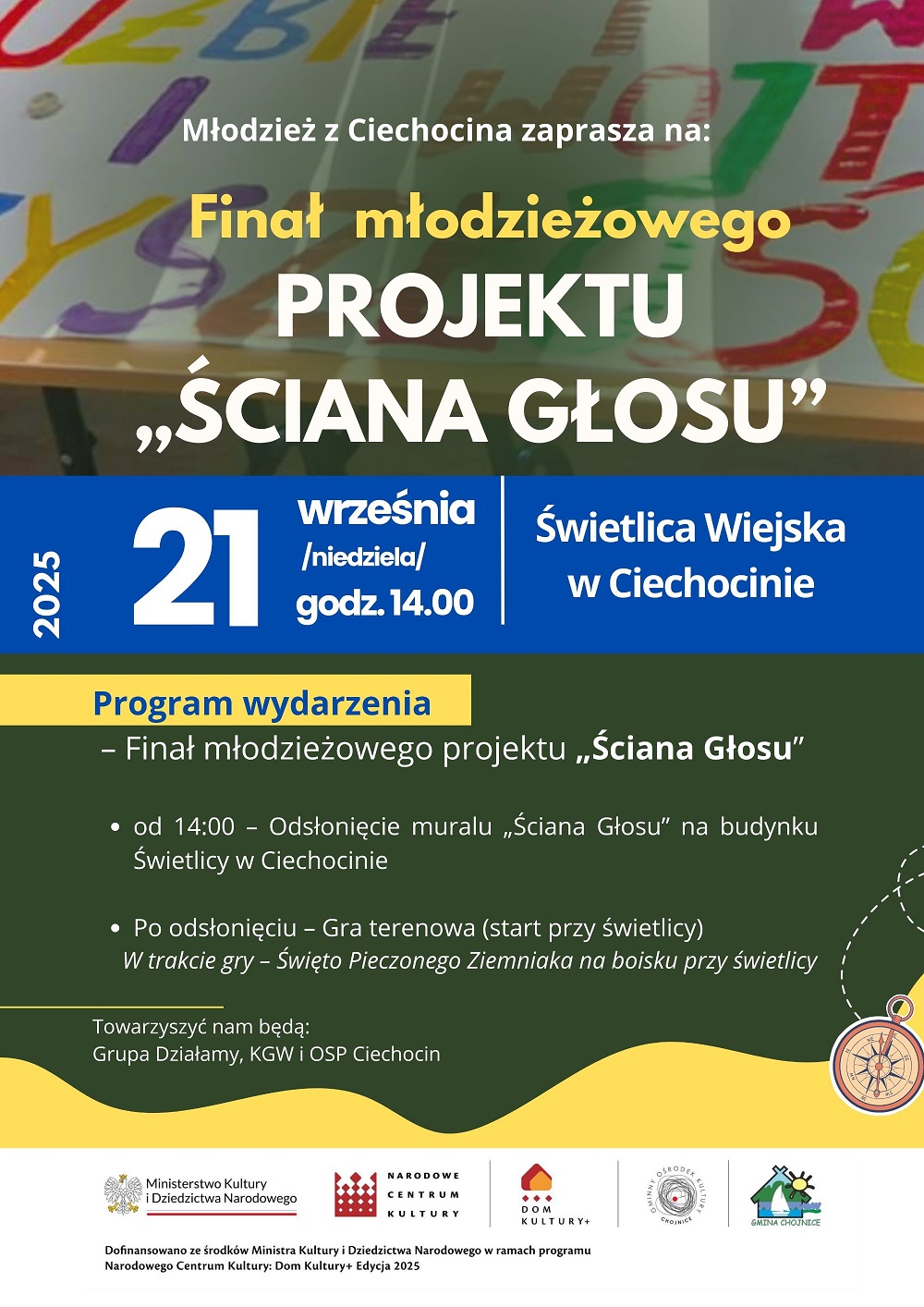 Już 21 września 2025 roku o godzinie 14:00 w Świetlicy Wiejskiej w Ciechocinie odbędzie się wyjątkowe wydarzenie - finał młodzieżowego projektu „Ściana Głosu”. To inicjatywa młodych mieszkańców gminy, którzy wspólnie pracowali nad stworzeniem miejsca, gdzie każdy będzie mógł symbolicznie zostawić swój głos, myśl czy emocję.
