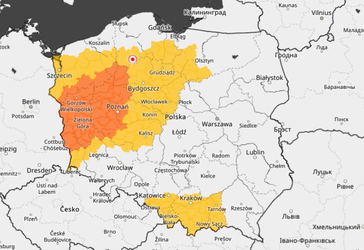 Prognozowane są burze, którym miejscami będą towarzyszyć silne opady deszczu do 20 mm oraz porywy wiatru do 80 km/h. Lokalnie grad.