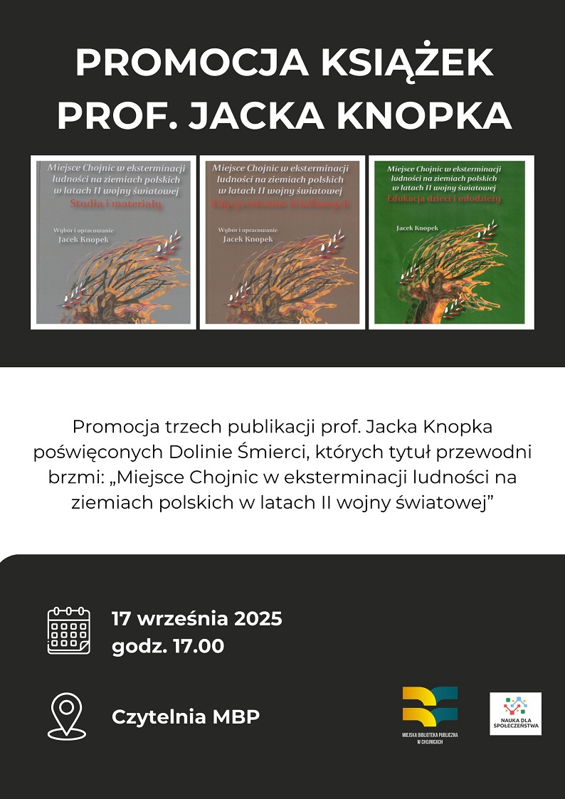 W środę 17 września 2025 roku w Czytelni Miejskiej Biblioteki Publicznej w Chojnicach odbędzie się promocja trzech publikacji prof. Jacka Knopka poświęconych Dolinie Śmierci, których tytuł przewodni brzmi: „Miejsce Chojnic w eksterminacji ludności na ziemiach polskich w latach II wojny światowej”. Początek godz. 17:00.