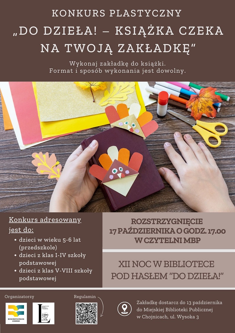 Miejska Biblioteka Publiczna w Chojnicach i Stowarzyszenie LekTURa zapraszają dzieci do wzięcia udziału w konkursie plastycznym „Do dzieła! – książka czeka na Twoją zakładkę”, który organizowany jest w ramach XII Nocy w Bibliotece pod hasłem „Do dzieła!”.