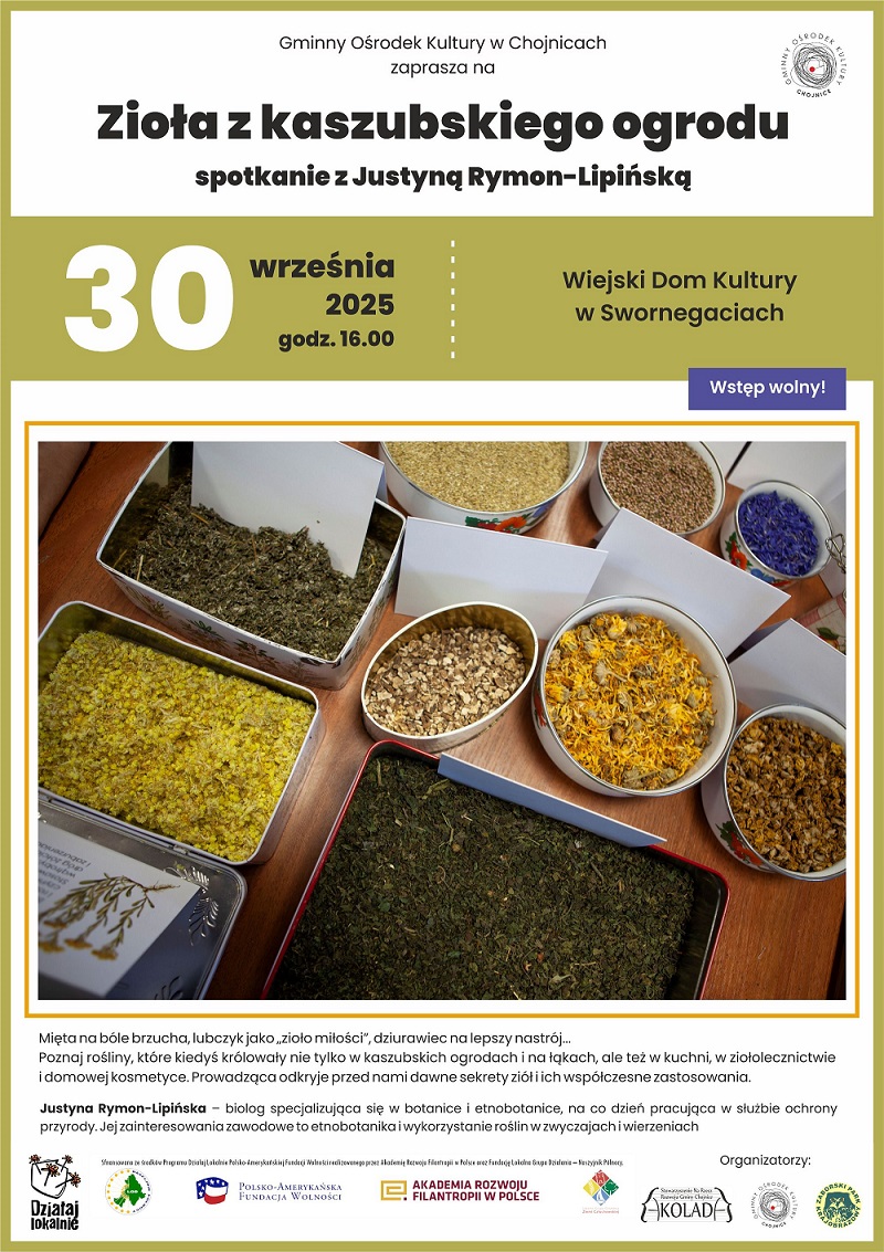 30 września 2025 roku o godz. 16:00 w Wiejskim Domu Kultury w Swornegaciach odbędzie się spotkanie z Justyną Rymon-Lipińską – biologiem, specjalistką w dziedzinie botaniki i etnobotaniki.