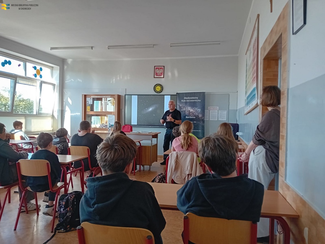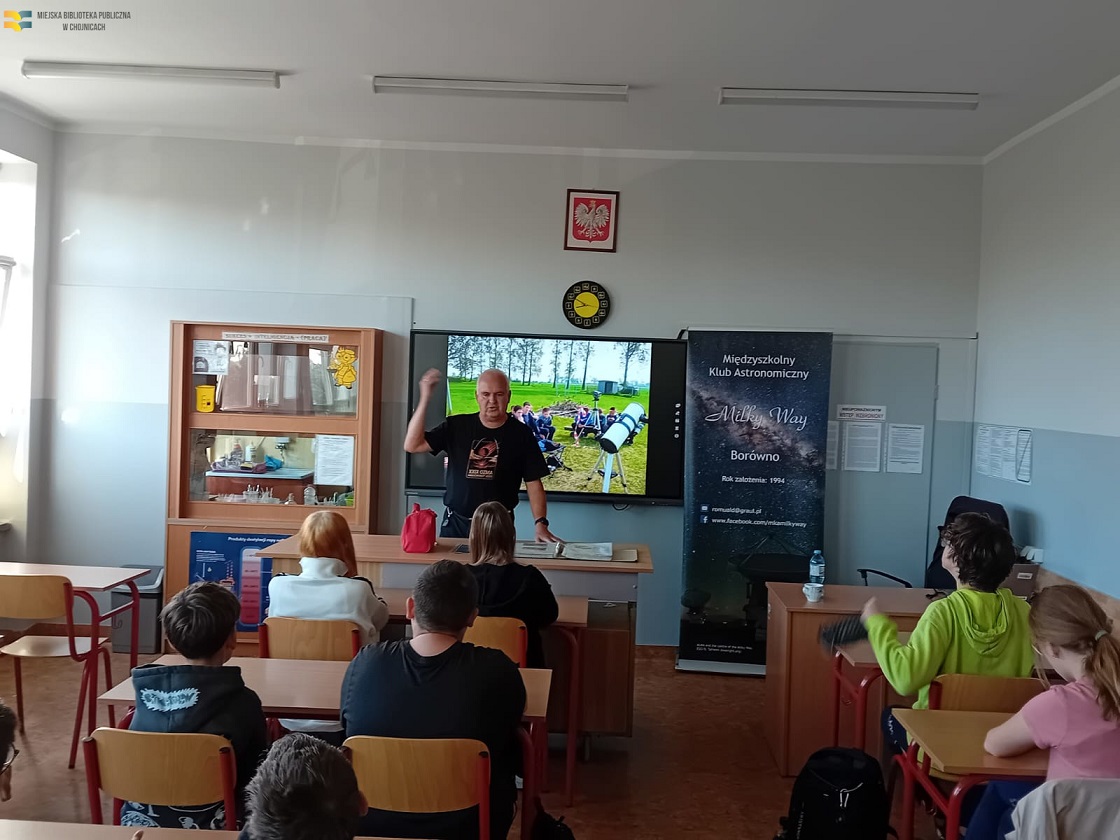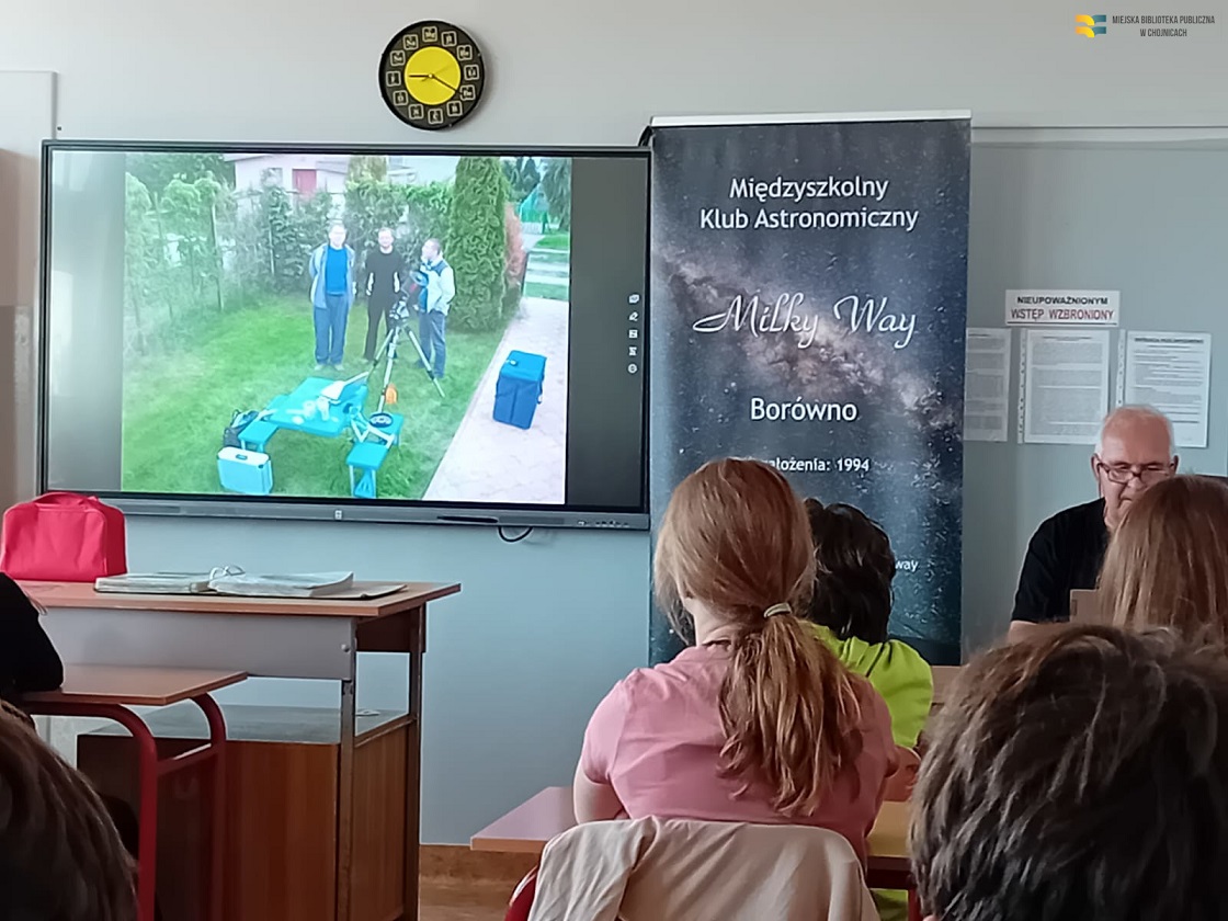 Romuald Graul w niezwykle ciekawy sposób podzielił się z uczniami swoją ogromną wiedzą. Opowiadał o fascynacji niebem, odkrywaniu tajemnic gwiazd i pasji, która towarzyszy mu od wielu lat. Spotkanie wzbogaciła prezentacja fotografii astronomicznych oraz z działalności założonego przez gościa Międzyszkolnego Klubu Astronomicznego „Milky Way”. Swoją prelekcję wzbogacił opowieścią o chojniczaninie Janie Danielu Titiusie, uczonym, którego dorobek wpisał się w historię światowej nauki.