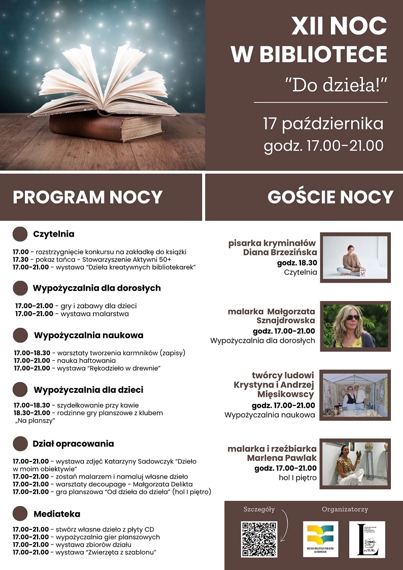 Miejska Biblioteka Publiczna w Chojnicach oraz Stowarzyszenie LekTURa zapraszają na kolejną XII Noc w Bibliotece, która odbędzie się w ramach ogólnopolskiej Nocy Bibliotek, a jej hasło przewodnie brzmi: „Do dzieła!”.