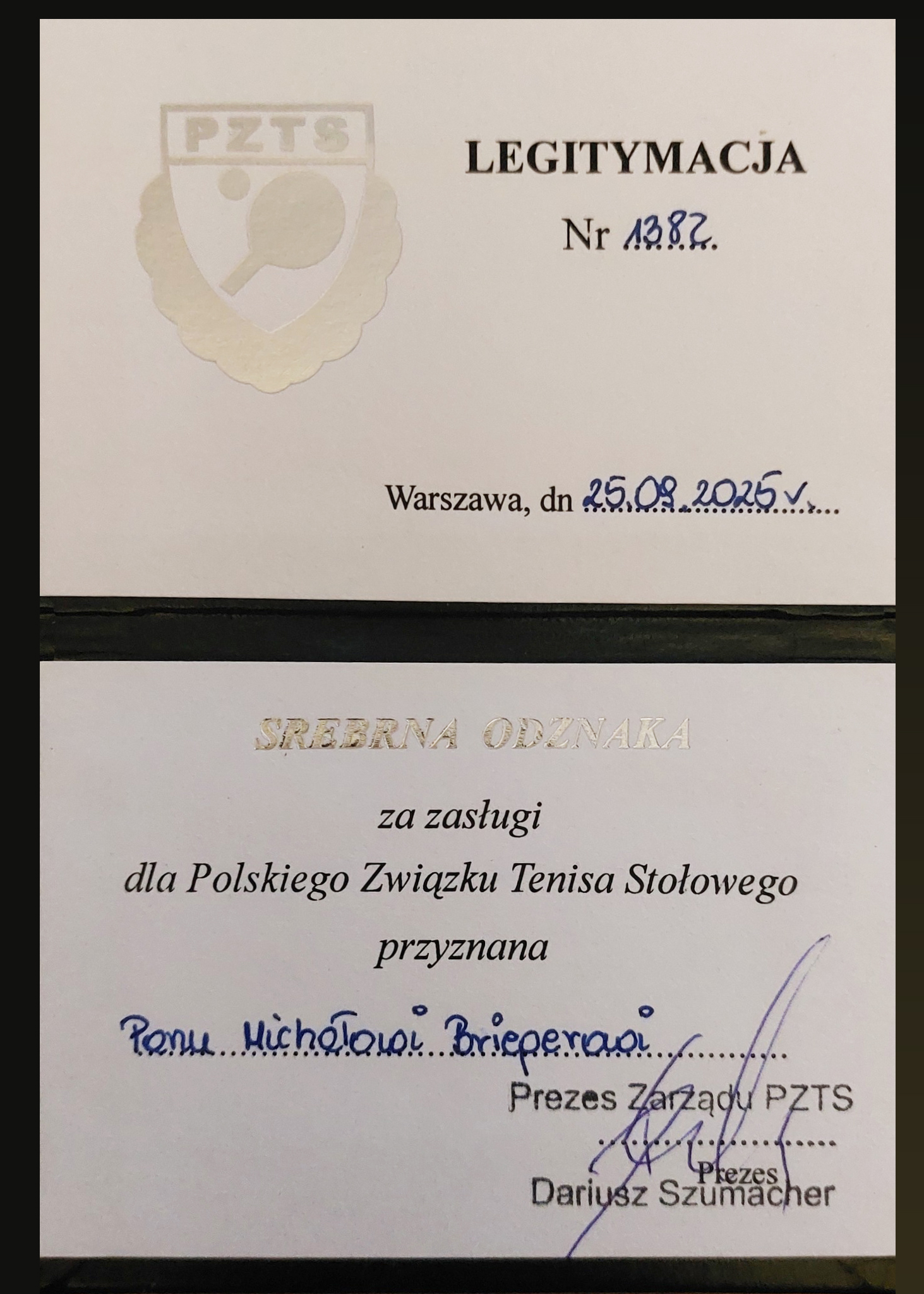 Podczas Zwyczajnego Walnego Zjazdu Delegatów Pomorskiego Wojewódzkiego Związku tenisa Stołowego w Gdańsku w poniedziałek (06.10) Michał Brieger z Chojnic otrzymał srebrną odznakę Polskiego Związku Tenisa Stołowego.