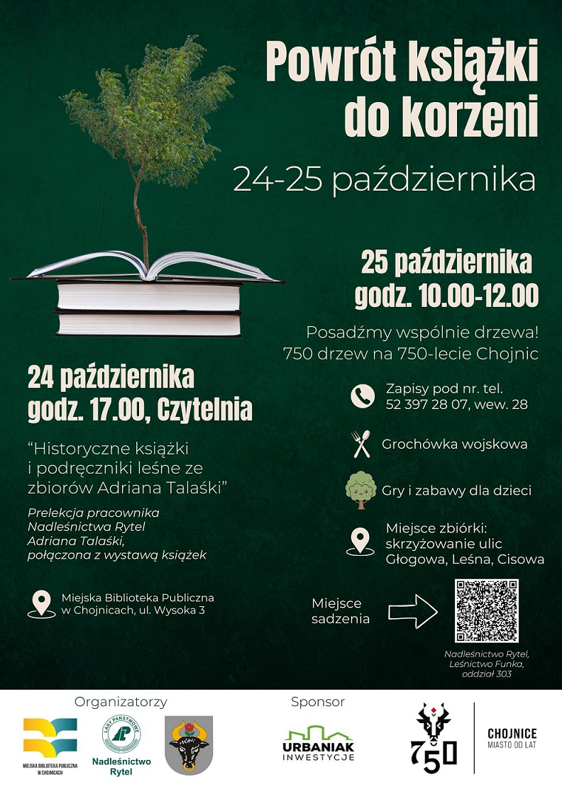 Natomiast w sobotę 25 października zapraszamy do wspólnego sadzenie drzew – 750 drzew na 750-lecie Chojnic. Sadzenie drzew planujemy zrealizować na terenie Leśnictwa Funka, w oddziale 303 (las za chojnickim szpitalem, na granicy miasta i gminy Chojnice – dokładna lokalizacja znajduje się na plakacie pod kodem QR). Miejsce zbiórki to skrzyżowanie ulic Głogowa, Leśna, Cisowa w Chojnicach. Akcja odbędzie się w godz. 10:00-12:00. Atrakcjami dodatkowymi będą gry i zabawy dla dzieci przygotowane przez organizatorów oraz grochówka wojskowa. Prosimy o wcześniejsze zgłaszanie się pod nr. tel. 52 397 28 07, wew. 28 (Czytelnia). Liczba uczestników sadzenia jest ograniczona.