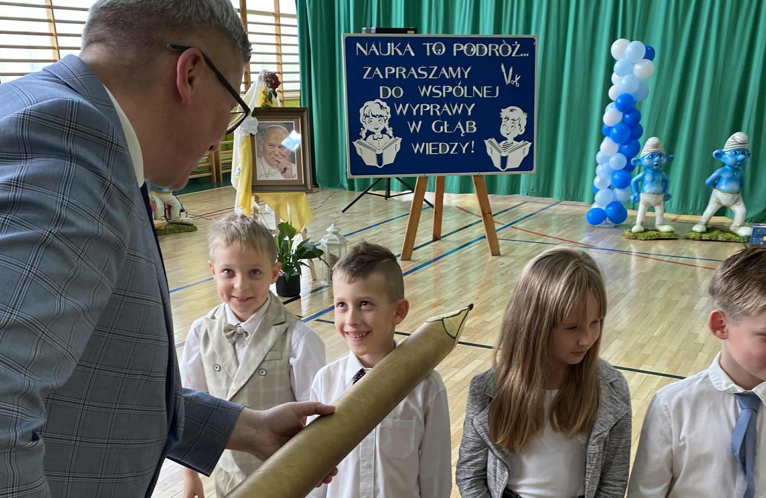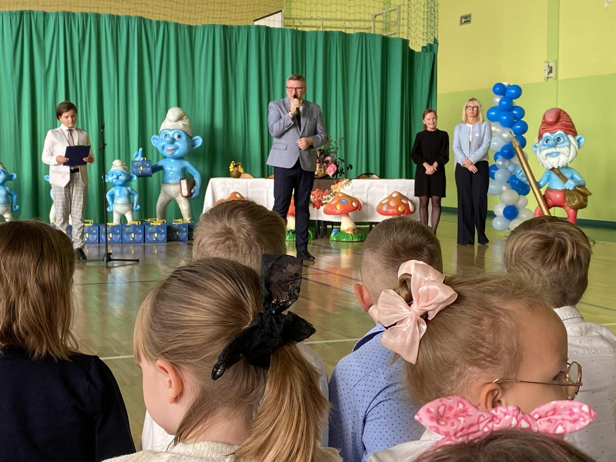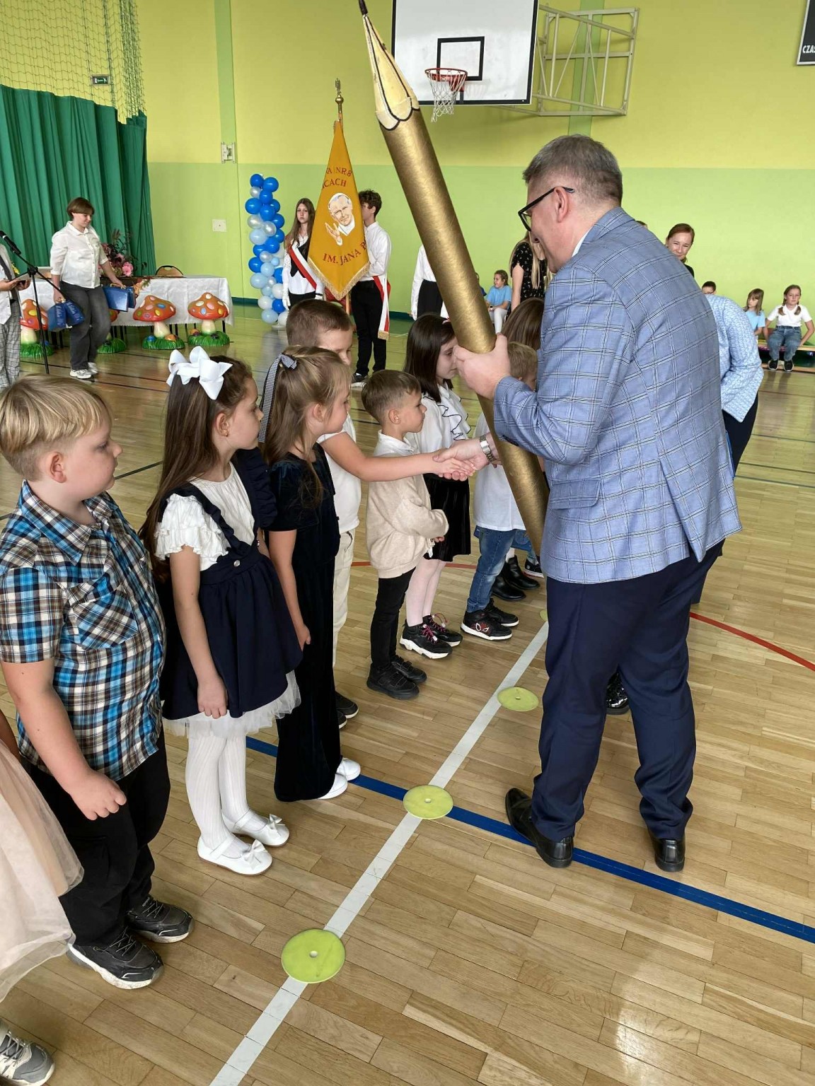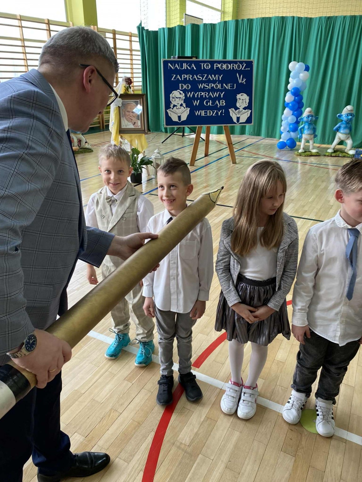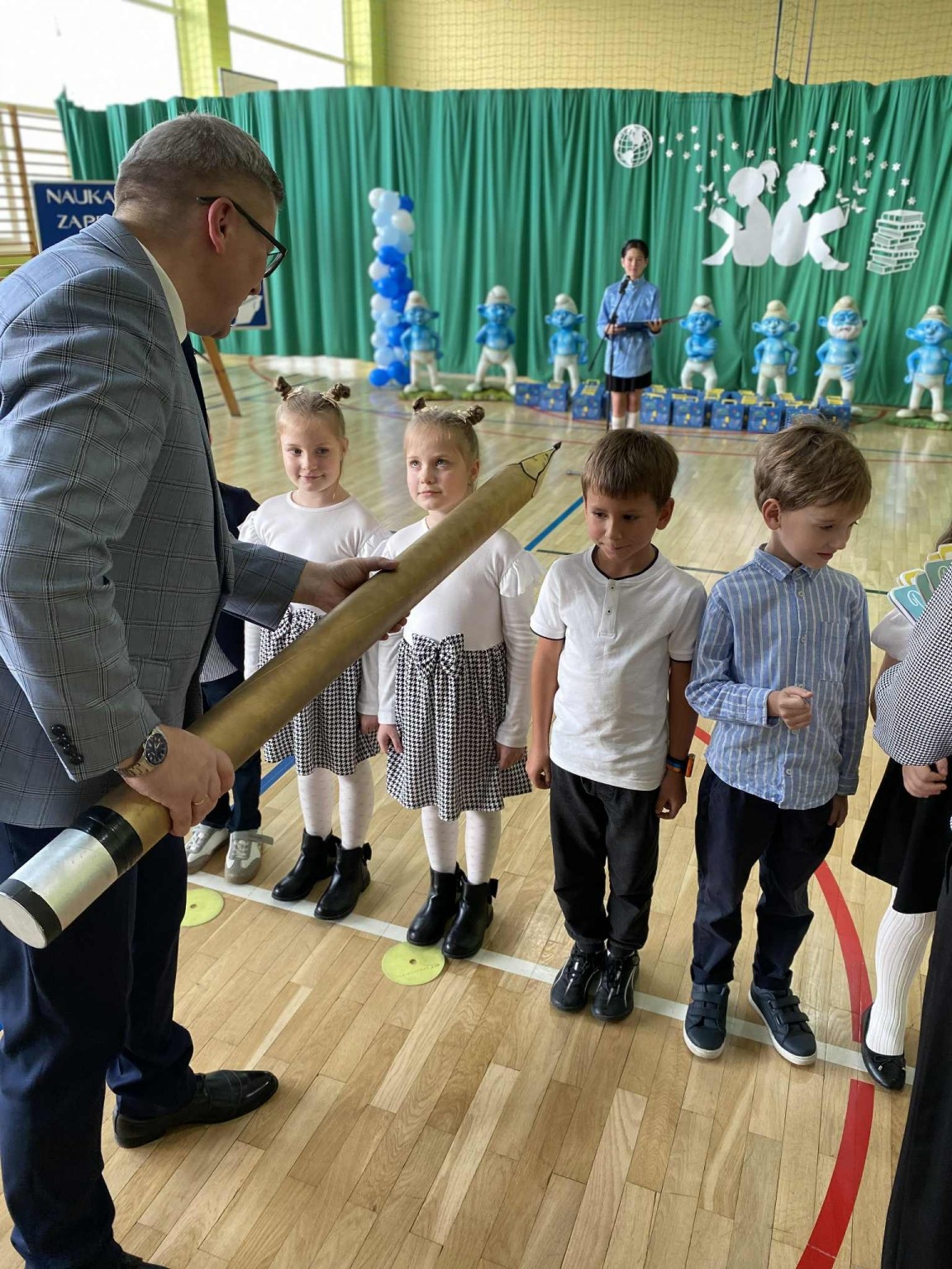 Najbardziej symboliczny i wzruszający moment to oczywiście pasowanie na ucznia wielkim ołówkiem, którego dokonał dyrektor szkoły, pan Jarosław Gomółka.