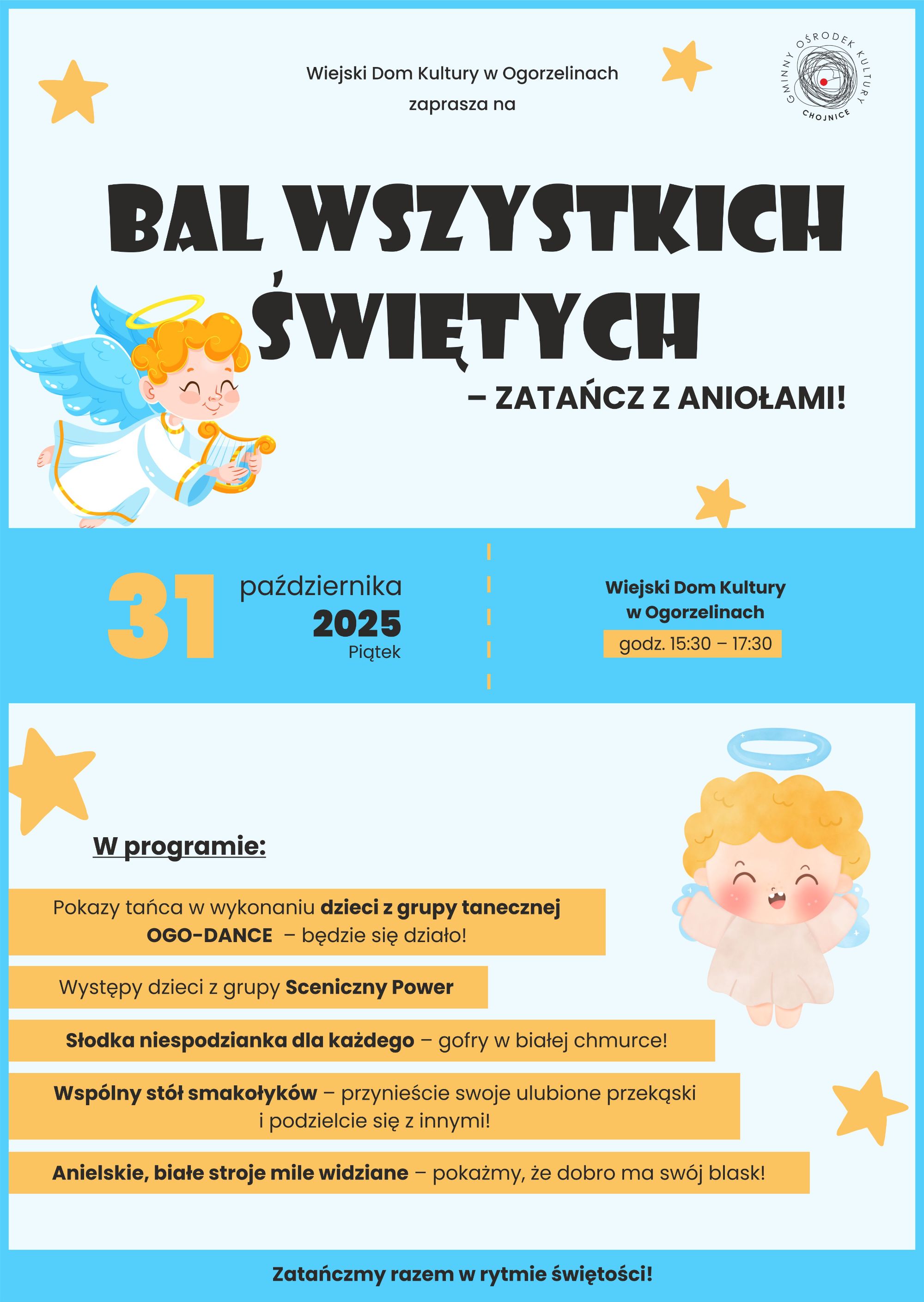Już 31 października 2025 roku w sali Wiejskiego Domu Kultury w Ogorzelinach odbędzie się wyjątkowe wydarzenie - Bal Wszystkich Świętych pod hasłem „Zatańcz z aniołami!”.
