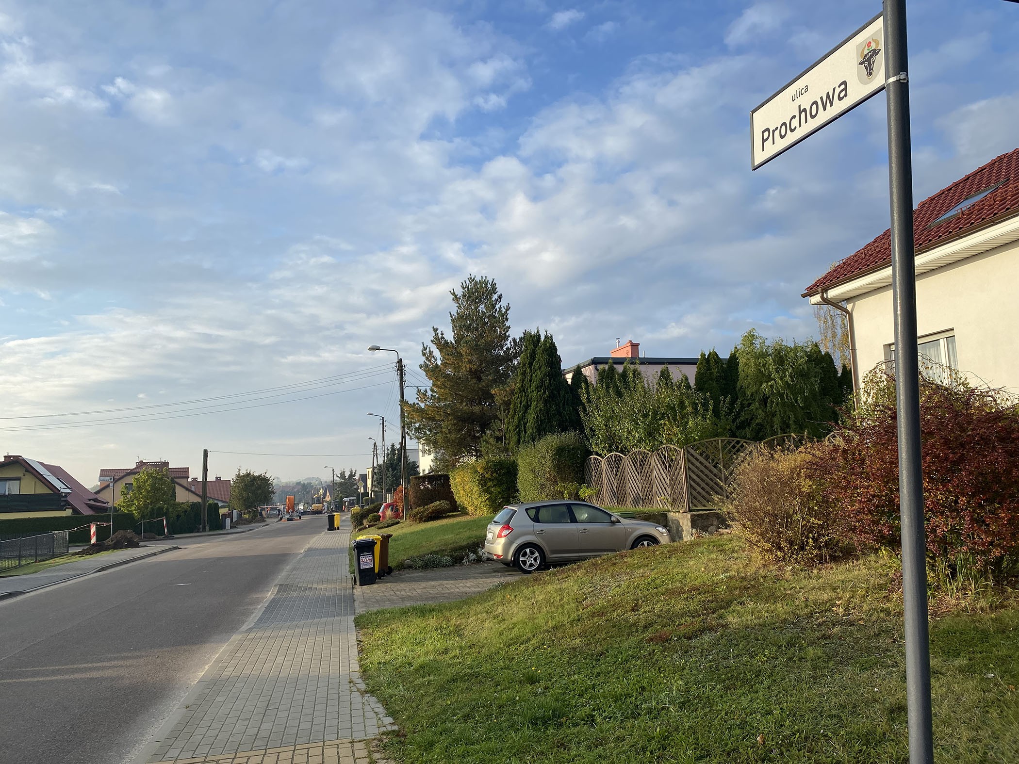 Przedmiot zamówienia obejmuje tu m.in. budowę obustronnego chodnika od skrzyżowania z ul. Kasprzaka do zjazdu do posesji nr 73 przy ul. Prochowej, budowę fragmentu nawierzchni ul. Prochowej z płyt MON, a także budowę oświetlenia ulicznego. Tu należy dokonać odtworzenia nawierzchni chodnika na odcinku od skrzyżowania z al. Brzozową do skrzyżowania z ul. Kasprzaka, zlikwidować stare oświetlenie - linię napowietrzną, wraz z demontażem wysięgników i opraw.