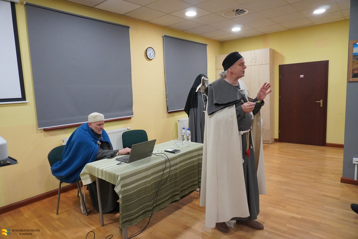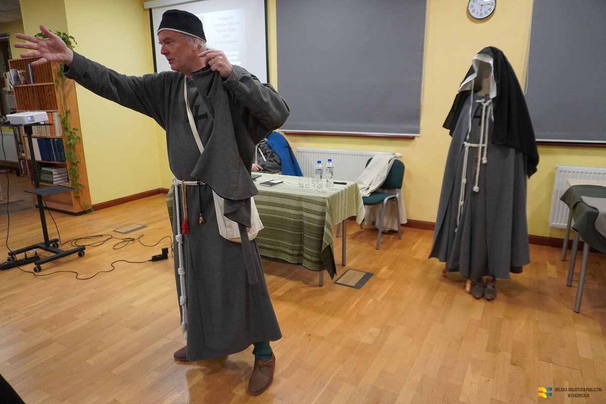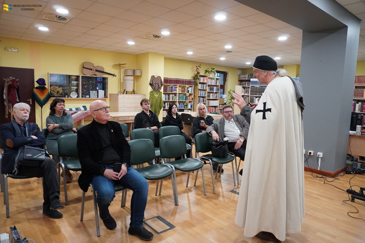 O tym, że członkowie zakonu krzyżackiego, a właściwe Zakonu Niemieckiego, nosili inne stroje, niż znamy z obrazów, filmów czy rekonstrukcji historycznych mogli przekonać się uczestnicy spotkania z Arkadiuszem Dzikowskim i Tomaszem Bogdanowiczem, które odbyło się we wtorek 21 października 2025 roku w Miejskiej Bibliotece Publicznej w Chojnicach.