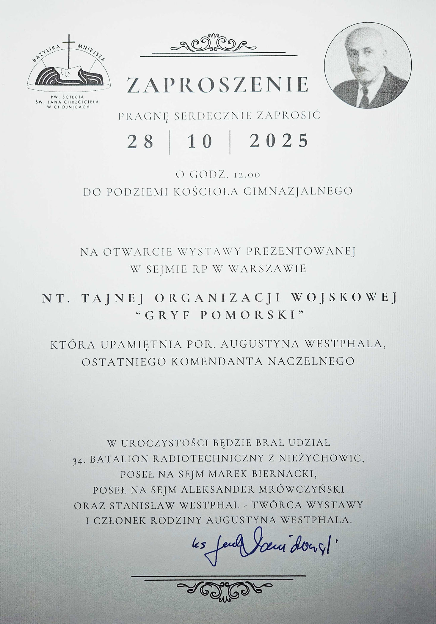 28 października 2025 roku o godzinie 12:00 w podziemiach Kościoła Gimnazjalnego w Chojnicach odbędzie się uroczyste otwarcie wystawy poświęconej Tajnej Organizacji Wojskowej „Gryf Pomorski”.