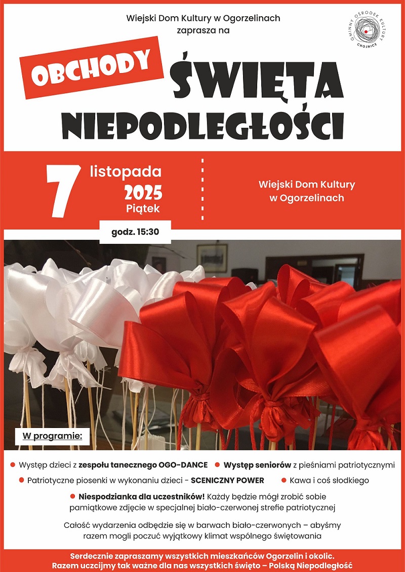Wiejski Dom Kultury w Ogorzelinach zaprasza wszystkich mieszkańców wsi i okolic do wspólnego świętowania Narodowego Święta Niepodległości. Uroczystość odbędzie się w piątek, 7 listopada 2025 roku o godz. 15:30 w sali miejscowego domu kultury.