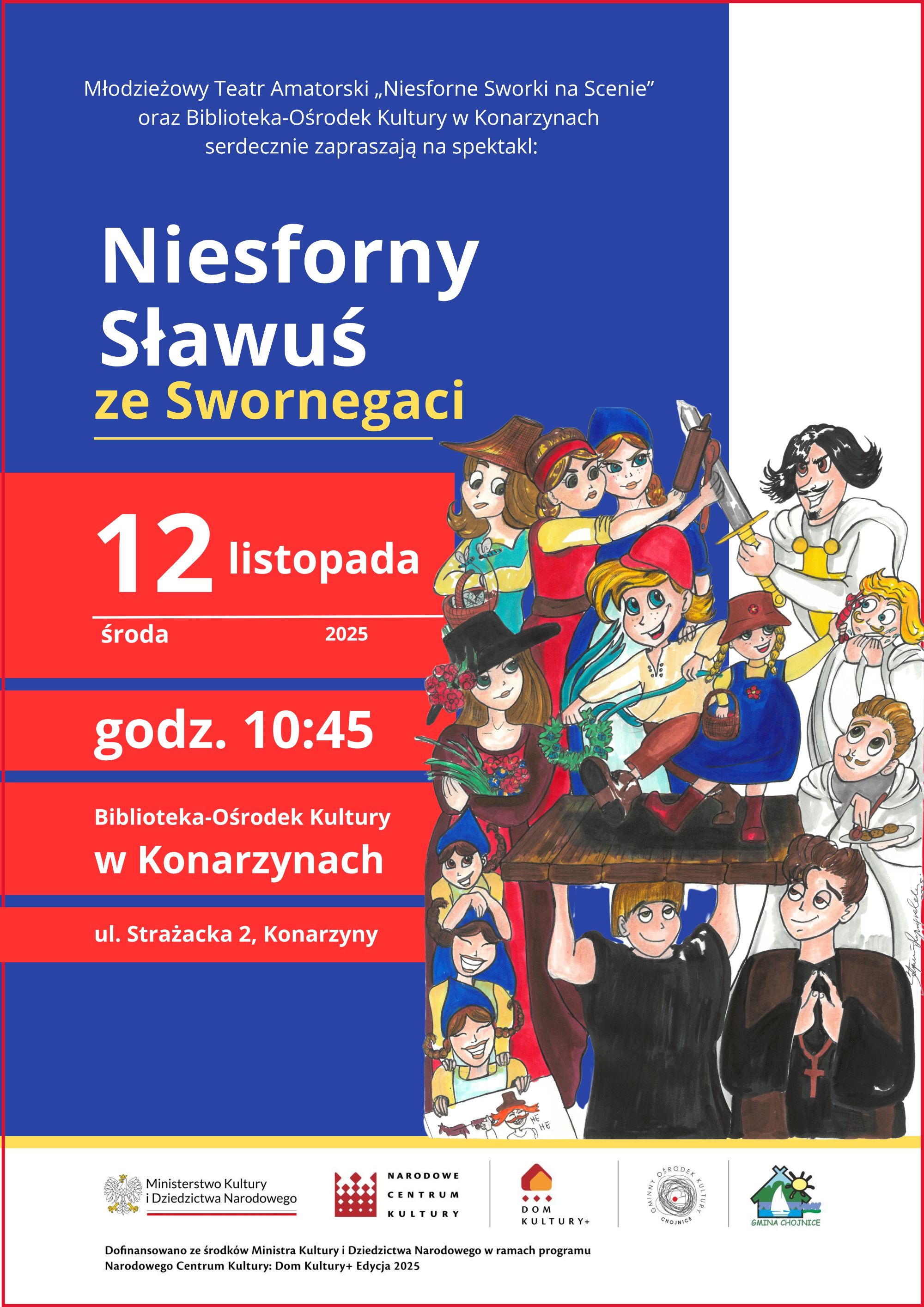 Już po raz drugi młodzi aktorzy z Młodzieżowego Teatru Amatorskiego „Niesforne Sworki na Scenie” zaprezentują swój pełen humoru i energii spektakl „Niesforny Sławuś ze Swornegaci”.