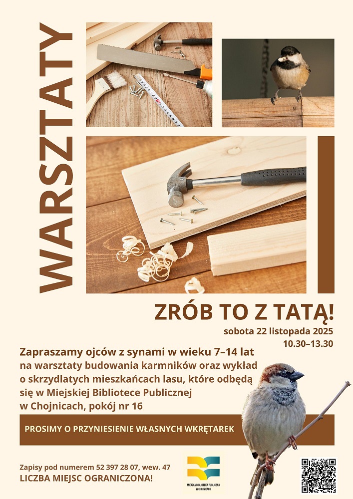 Miejska Biblioteka Publiczna w Chojnicach zaprasza ojców i synów do wspólnego spędzenia czasu podczas wydarzenia „Zrób to z tatą!”, w czasie którego odbędą się warsztaty budowania karmników oraz wykład o skrzydlatych mieszkańcach lasu.